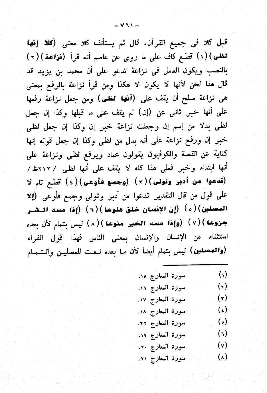 قبل كلا في جميع القرآن، قال ثم يستأنف كلا معنى {كلا إنها لظى} قطع كاف على ما روى عن عاصم أنه قرأ {نزاعة} بالنصب ويكون العامل في نزاعة تدعو على أن محمد بن يزيد قد قال هذا لحن لأنها لا يكون إلا هكذا ومن قرأ نزاعة بالرفع بمعنى هي نزاعة صلح أن يقف على {أنها لظى} ومن جعل نزاعة رفعها على أنها خبر ثاني عن {إن} لم يقف على ما قبلها وكذا إن جعل لظى بدلا من إسم إن وجعلت نزاعة خبر إن وكذا إن جعل لظى خبر إن ورفع نزاعة على أنه بدل من لظى وكذا إن جعل قوله إنها كناية عن القصة والكوفيون يقولون عماد ويرفع لظى ونزاعة على أنها ابتداء وخبر فعلى هذا كله لا يقف على أنها لظى {تدعو من أدبر وتولى} {وجمع فأوعى} قطع تام لا على قول من قال التقدير تدعوا من أدبر وتولى وجمع فأوعى {إلا المصلين} {إن الإنسان خلق هلوعا} {إذا مسه الشر جزوعا} {وإذا مسه الخير منوعا} ليس بتمام لأن بعده استثناء من الإنسان والإنسان بمعنى الناس فهذا قول الفراء {والمصلين ليس بتمام أيضا لأن ما بعده نعت للمصلين والتمام