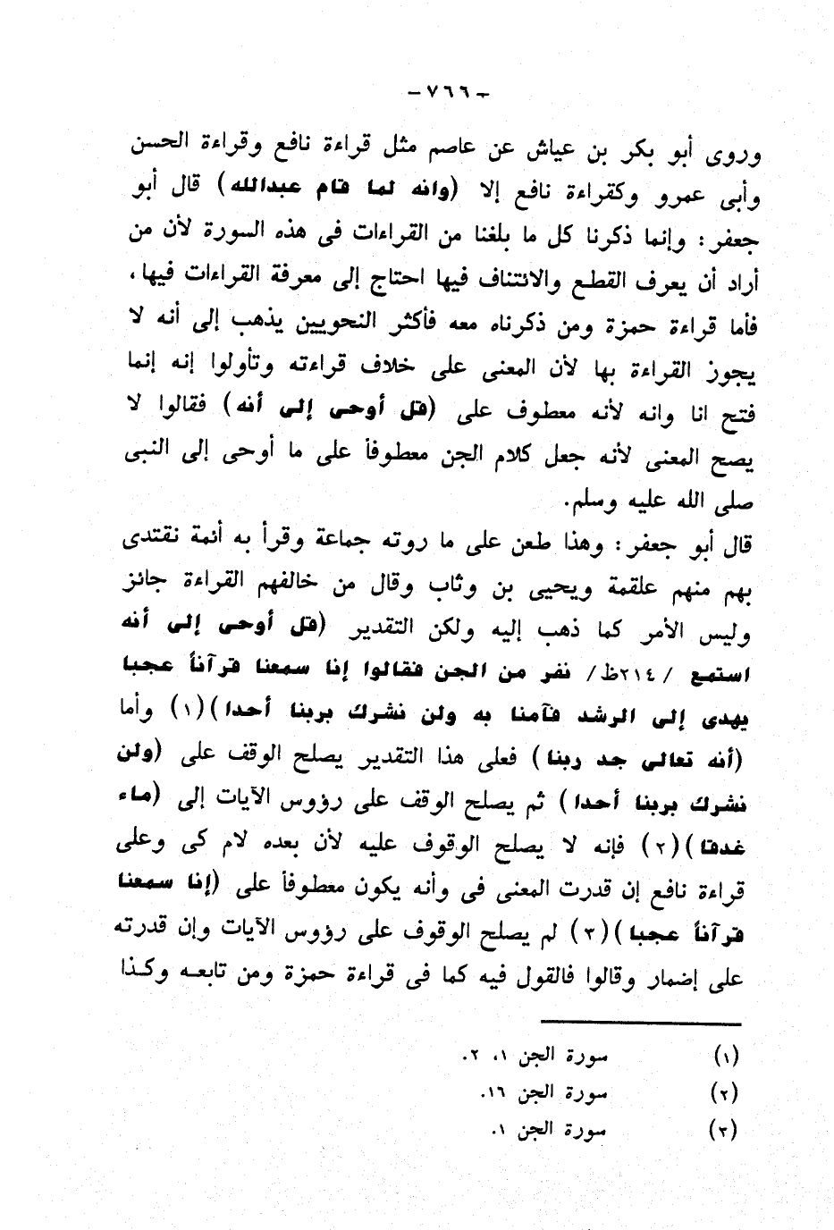وروى أبو بكر بن عياش عن عاصم مثل قراءة نافع وقراءة الحسن وأبي عمرو وكقراءة نافع إلا {وأنه لما قام عبد الله} قال أبو جعفر: وإنما ذكرنا كل ما بلغنا من القراءات في هذه السورة لأن من أراد أن يعرف القطع والائتناف فيها احتاج إلى معرفة القراءات فيها، فأما قراءة حمزة ومن ذكرناه معه فأكثر النحويين يذهب إلى أنه لا يجوز القراءة بها لأن المعنى على خلاف قراءته وتأولوا إنه إنما فتح أنا وأنه لأنه معطوف على {قل أوحي إلي أنه} فقالوا لا يصح المعنى لأنه جعل كلام الجن معطوفا على ما أوحي إلى النبي صلى الله عليه وسلم.