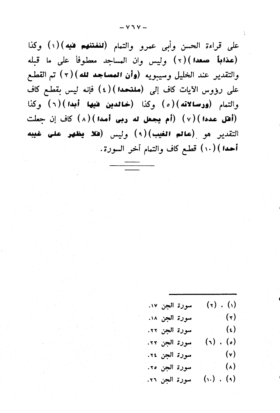 على قراءة الحسن وأبي عمرو والتمام {لنفتنهم فيه} وكذا {عذابا صعدا} وليس وأن المساجد معطوفا على ما قبله والتقدير عند الخليل وسيبويه {وأن المساجد لله} تم القطع على رؤوس الآيات كاف إلى {ملتحدا} فإنه ليس بقطع كاف والتمام {ورسالاته} وكذا {خالدين فيها أبدا} وكذا {أقل عددا} {أم يجعل له ربي أمدا} كاف إن جعلت التقدير هو {عالم الغيب} وليس {فلا يظهر على غيبة أحدا} قطع كاف والتمام آخر السورة.