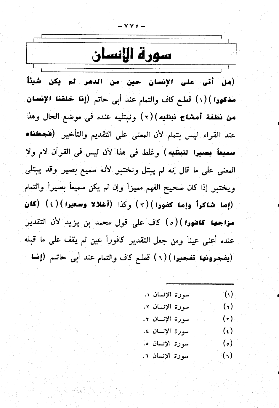 {هل أتى على الإنسان حين من الدهر لم يكن شيئا مذكورا} قطع كاف والتمام عند أبي حاتم {إنا خلقنا الإنسان من نطفة أمشاج نبتليه} ونبتليه عنده في موضع الحال وهذا عند القراء ليس بتمام لأن لأن المعنى على التقديم والتأخير {فجعلناه سميعا بصيرا لنبتليه} وغلط في هذا لأن ليس في القرآن لام ولا المعنى على ما قال إنه لم يبتل ونختبر لأنه سميع بصير وقد يبتلى ويختبر إذا كان صحيح الفهم مميزا وإن لم يكن سميعا بصيرا والتمام {إما شاكرا وإما كفورا} وكذا {أغلالا وسعيرا} {كان مزاجها كافورا} كاف على قول محمد بن يزيد لأن التقدير عنده أعني عينا ومن جعل التقدير كافورا عين لم يقف على ما قبله {يفجرونها تفجيرا} قطع كاف والتمام عند أبي حاتم {إنا