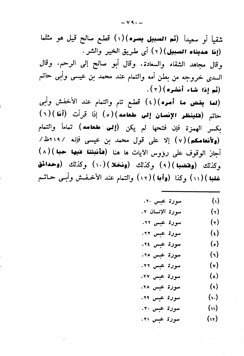 {لما يقض ما أمره} قطع تام والتمام عند الأخفش وأبي حاتم {فلينظر الإنسان إلى طعامه} إذا قرأت {أنا} بكسر الهمزة فإن فتحها لم يكن {إلى طعامه} تماما والتمام {ولأنعامكم} إلا على قول محمد بن عيسى فإنه أجاز الوقوف على رؤوس الآيات ها هنا {فأنبتنا فيها حبا} وكذلك {وقضبا} وكذلك {ونخلا} وكذلك {وحدائق غلبا} وكذا (وأبا) والتمام عند الأخفش وأبي حاتم