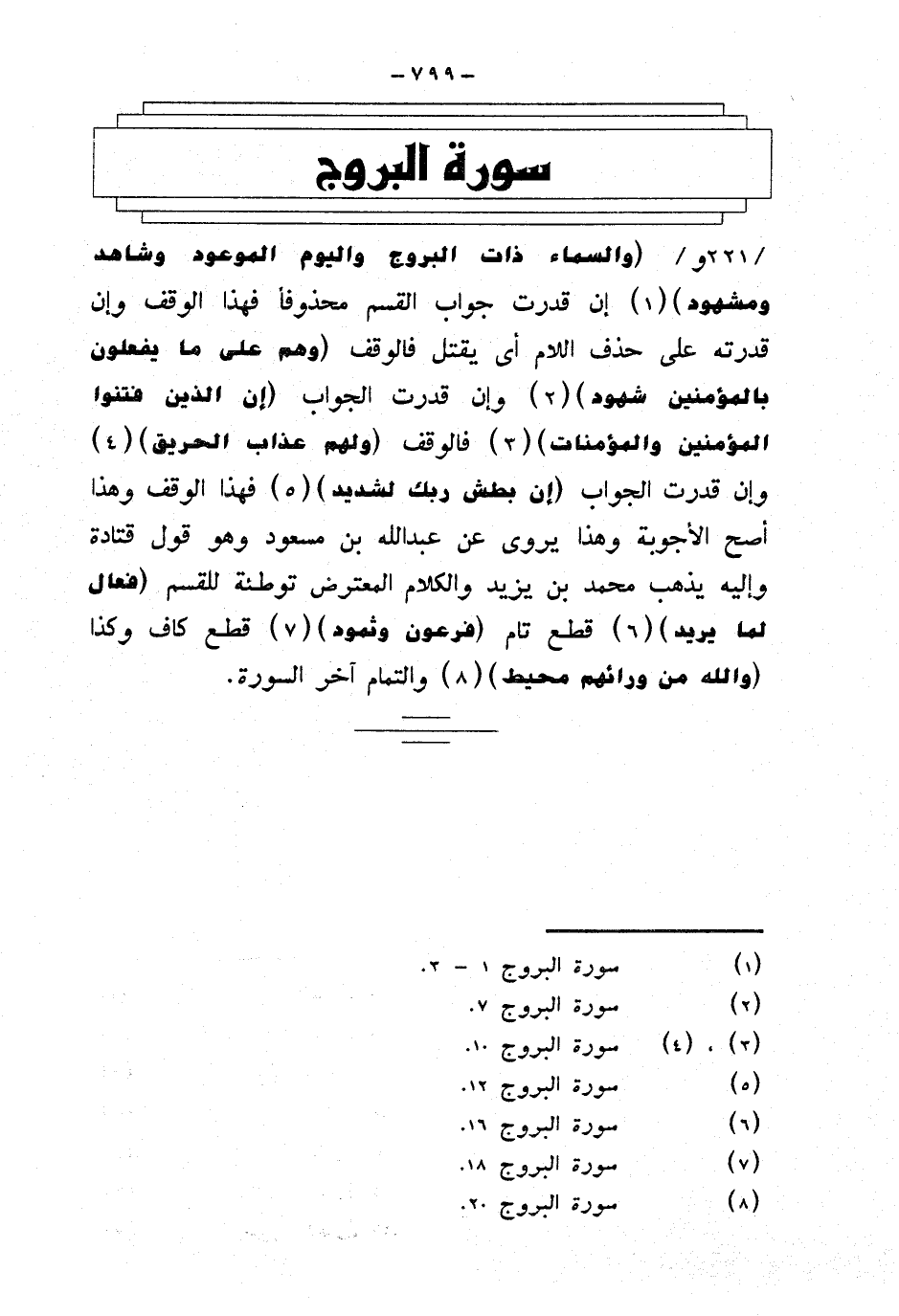{والسماء ذات البروج واليوم الموعود وشاهد ومشهود} إن قدرت جواب القسم محذوفا فهذا الوقف وإن قدرته على حذف اللام أي يقتل فالوقف {وهم على ما يفعلون بالمؤمنين شهود} وإن قدرت الجواب {إن الذين فتنوا المؤمنين والمؤمنات} فالوقف {ولهم عذاب الحريق} وإن قدرت الجواب {إن بطش ربك لشديد} فهذا الوقف وهذا أصح الأجوبة وهذا يروى عن عبد الله بن مسعود وهو قول قتادة وإليه يذهب محمد بن يزيد والكلام المعترض توطئة للقسم {فعال لما يريد} قطع تام {فرعون وثمود} قطع كاف وكذا {والله من ورائهم محيط} والتمام آخر السورة ..