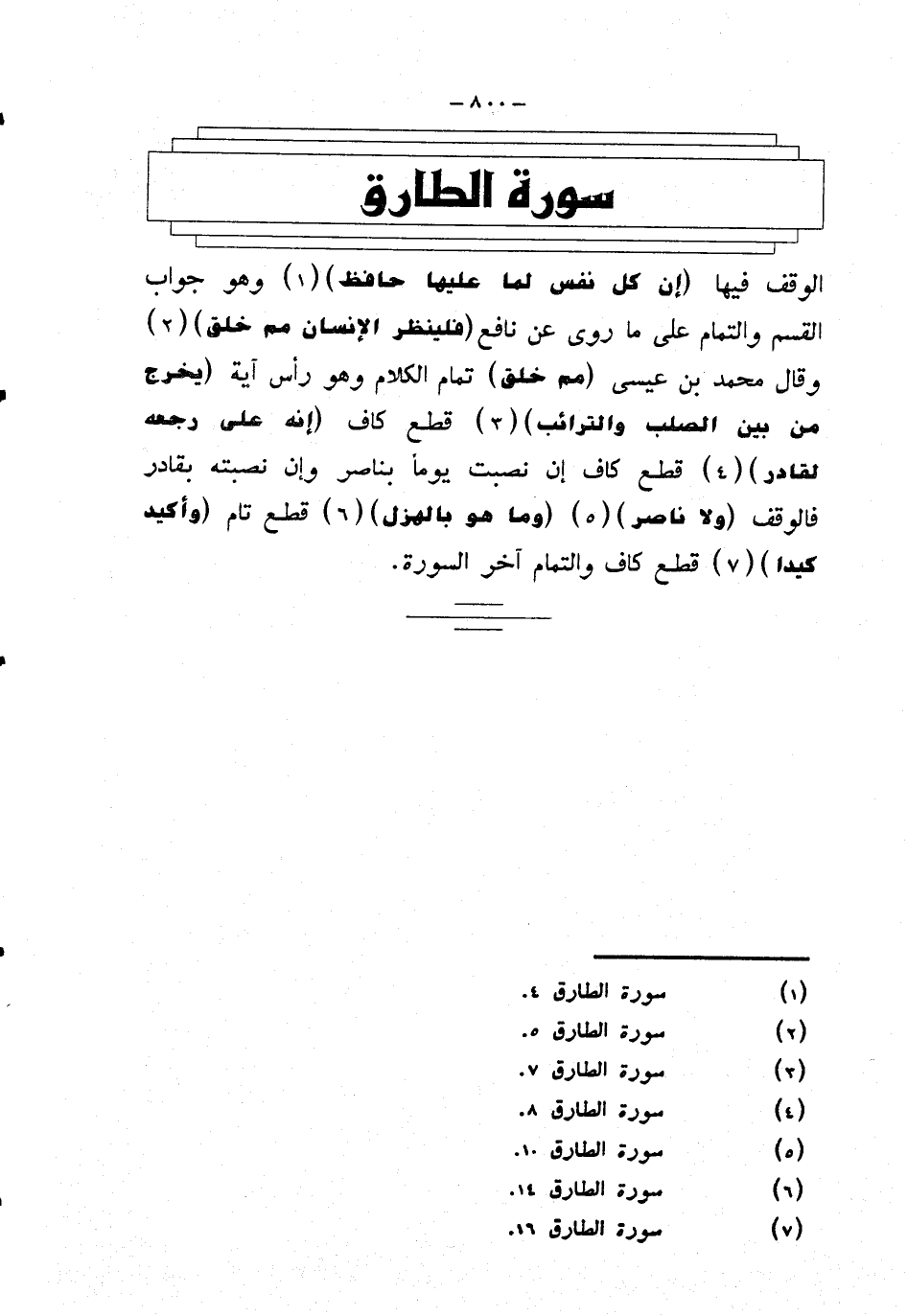 الوقف فيها {إن كل نفس لما عليها حافظ} وهو جواب القسم والتمام على ما روى عن نافع {فلينظر الإنسان مم خلق} وقال محمد بن عيسى {مم خلق} تمام الكلام وهو رأس آية {يخرج من بين الصلب والترائب} قطع كاف {إنه على رجعه لقادر} قطع كاف إن نصبت يوما بناصر وإن نصبته بقادر فالوقف {ولا ناصر} {وما هو بالهزل} قطع تام {وأكيد كيدا} قطع كاف والتمام آخر السورة ..