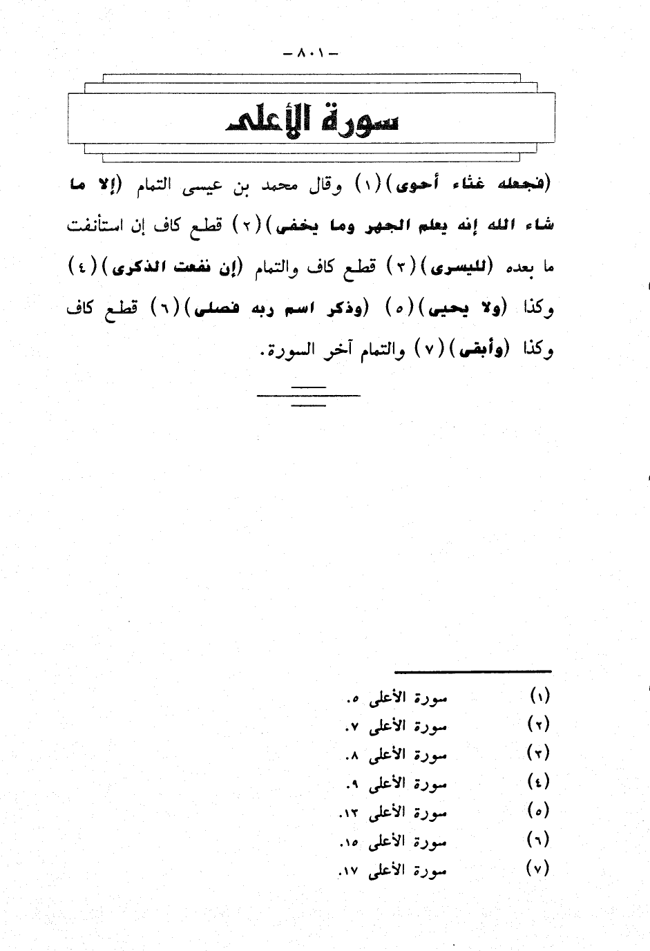 {فجعله غثاء أحوى} وقال محمد بن عيسى التمام {إلا ما شاء الله إنه يعلم الجهر وما يخفى} قطع كاف إن استأنفت ما بعده {لليسرى} قطع كاف والتمام {إن نفعت الذكرى} وكذا {ولا يحيى} {وذكر اسم ربه فصلى} قطع كاف وكذا {وأبقى} والتمام آخر السورة.