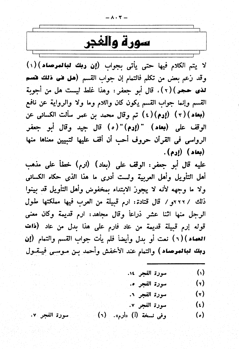 لا يتم الكلام فيها حتى يأتي بجواب {إن ربك لبالمرصاد} وقد زعم بعض من تكلم فالتمام إن جواب القسم {هل في ذلك قسم لذي حجر}، قال أبو جعفر: وهذا غلط ليست هل من أجوبة القسم وإنما جواب القسم يكون كان واللام وما ولا والرواية عن نافع {بعاد} {إرم} تم وقال محمد بن عمر سألت الكسائي عن الوقف على {بعاد} {إرم} قال جيد وقال أبو جعفر الرواسي في القرآن حروف أحب أن أقف عليها لتبيين معناها منها {بعاد} {إرم}.