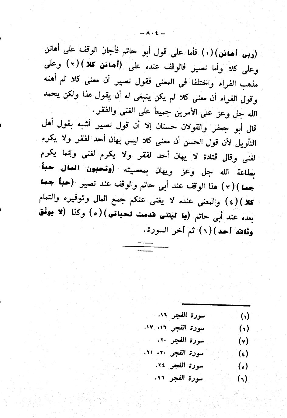 قال أبو جعفر والقولان حسنان إلا أن قول نصير أشبه بقول أهل التأويل لأن قول الحسن أن معنى كلا ليس يهان أحد لفقر ولا يكرم لغنى وقال قتادة لا يهان أحد لفقر ولا يكرم لغنى وإنما يكرم بطاعة الله جل وعز ويهان بمعصيته {وتحبون المال حبا جما} هذا الوقف عند أبي حاتم والوقف عند نصير {حبا جما كلا} والمعنى عنده لا يغني عنكم جمع المال وتوفيره والتمام بعده عند أبي حاتم {يا ليتني قدمت لحياتي} وكذا {لا يوثق وثاقه أحد} ثم آخر السورة ..