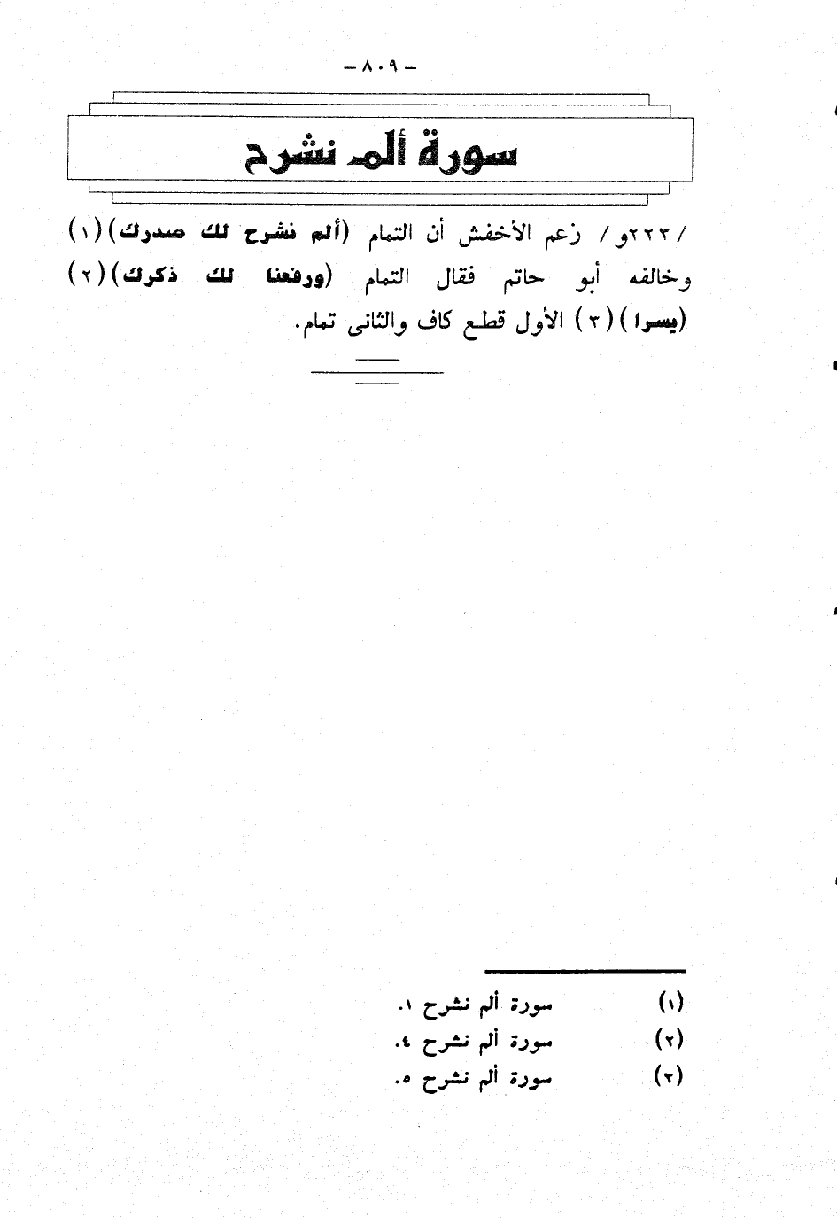 زعم الأخفش ان التمام {ألم نشرح لك صدرك} وخالفه أبو حاتم فقال التمام {ورفعنا لك ذكرك} {يسرا} الأول قطع كاف، والثاني تمام.