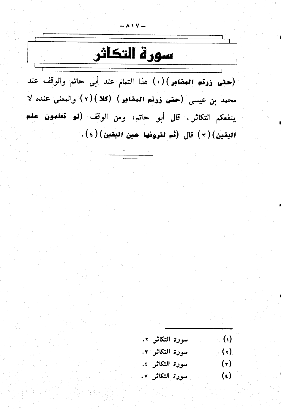 {حتى زرتم المقابر} هذا التمام عند ابي حاتم والوقف عند محمد بن عيسى {حتى زرتم المقابر} {كلا} والمعنى عنده لا ينفعكم التكاثر، قال أبو حاتم: ومن الوقف {لو تعلمون علم اليقيم} قال {ثم لترونها عين اليقين} ..