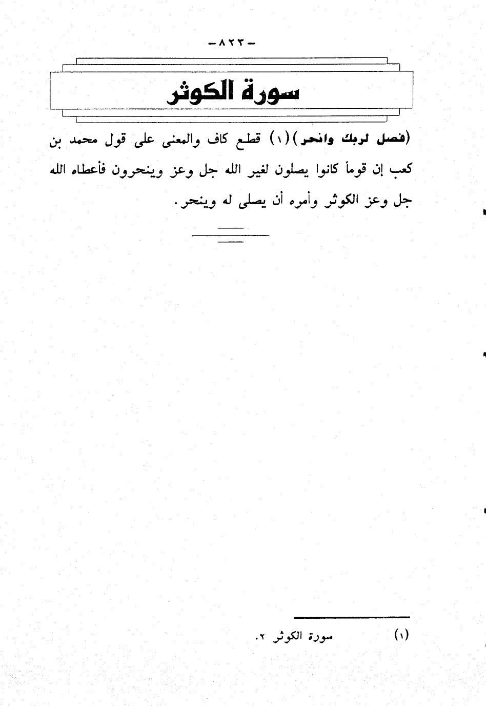 {فصل لربك وانحر} قطع كاف والمعنى على قول محمد بن كعب إن قوما كانوا يصلون لغير الله جل وعز وينحرون فأعطاه الله جل وعز الكوثر وأمره ان يصلي له وينحر.