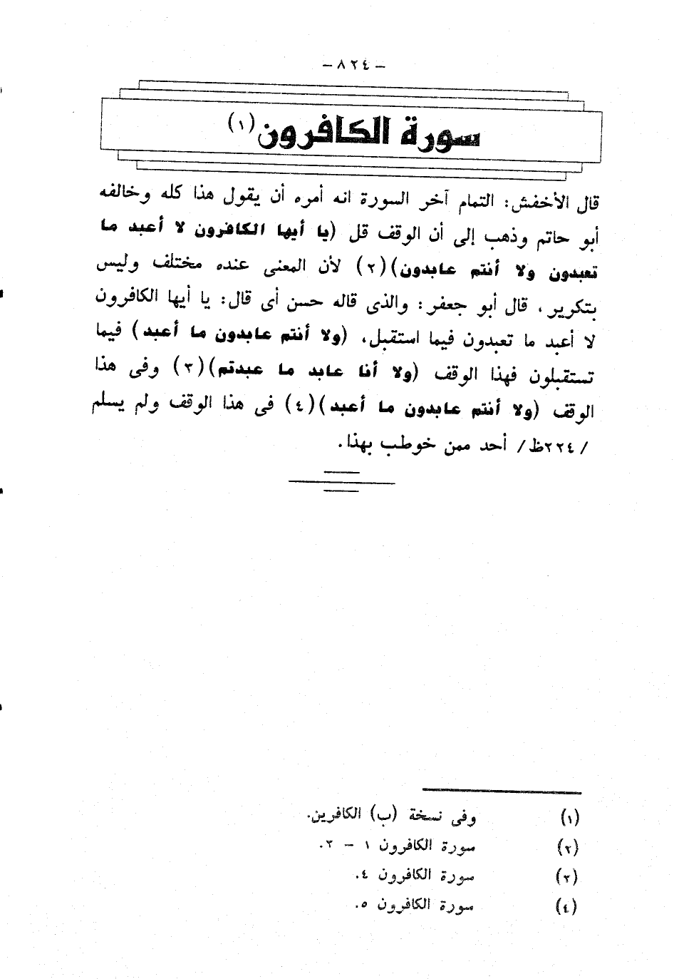 قال الأخفش: التمام آخر السورة أنه أمره أن يقول هذا كله وخالفه أبو حاتم وذهب إلى أن الوقف قل {يا أيها الكافرون لا أعبد ما تعبدون ولا أنتم عابدون} لأن المعنى عنده مختلف وليس بتكرير، قال أبو جعفر: والذي قاله حسن أي قال: يا أيها الكافرون لا أعبد ما تعبدون فيما استقبل، {ولا أنتم عابدون ما أعبد} فيما تستقبلون فهذا الوقف {ولا أنا عابد ما عبدتم} وفي هذا الوقف {ولا أنتم عابدون ما أعبد} في هذا الزقف ولم يسلم أحد ممن خوطب بهذا.