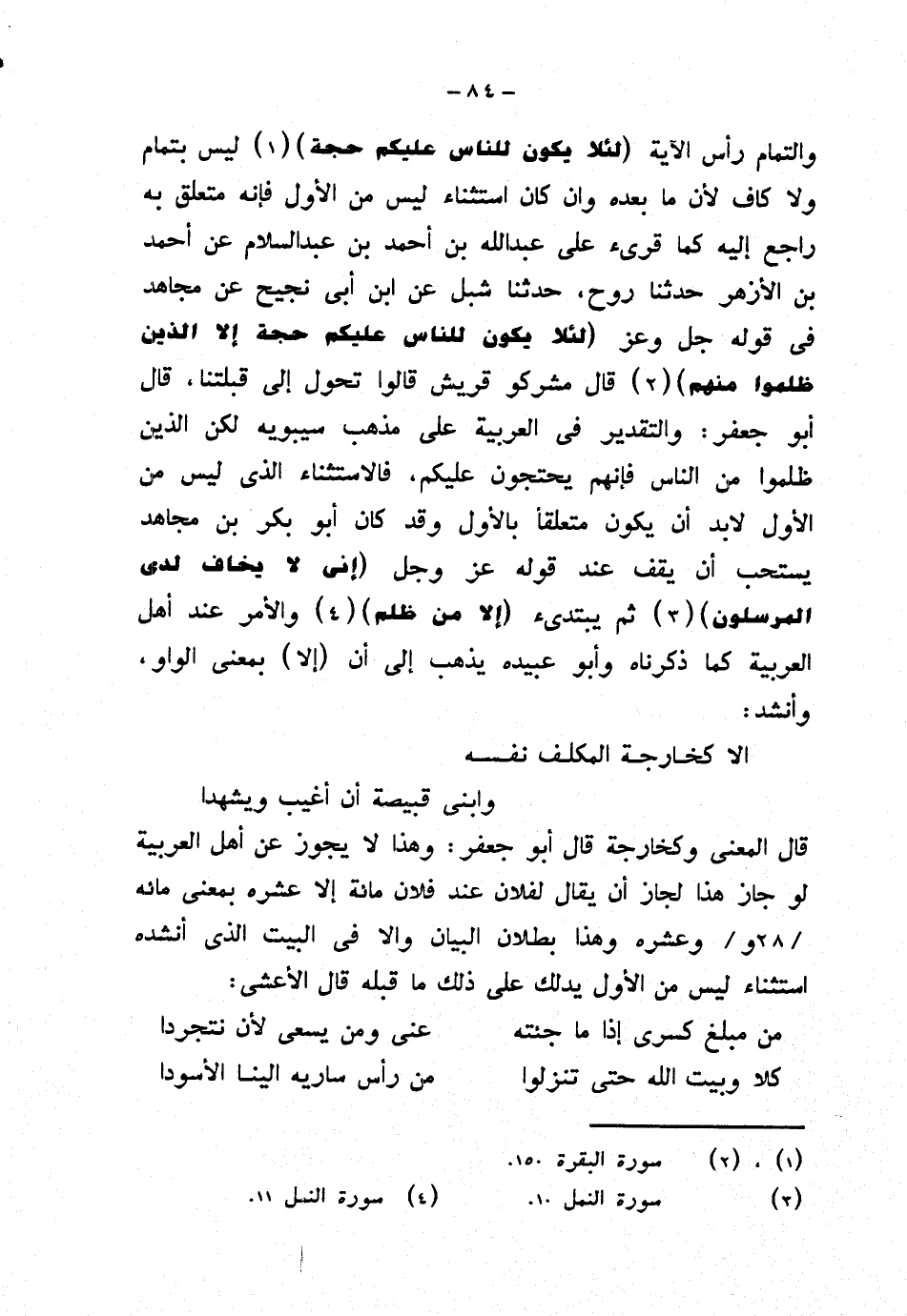 والتمام رأس الآية {لئلا يكون للناس عليكم حجة} ليس بتمام ولا كاف لأن ما بعده وإن كان استثناء ليس من الأول فإنه متعلق به راجع إليه كما قرئ على عبد الله بن أحمد بن عبد السلام عن أحمد بن الأزهر حدثنا روح، حدثنا شبل عن ابن أبي نجيح عن مجاهد في قوله جل وعز {لئلا يكون للناس عليكم حجة إلا الذين ظلموا منهم} قال مشركو قريش قالوا تحول إلى قبلتنا، قال أبو جعفر: والتقدير في العربية على مذهب سيبويه لكن الذين ظلموا من الناس فإنهم يحتجون عليكم، فالاستثناء الذي ليس من الأول لا بد أن يكون متعلقًا بالأول وقد كان أبو بكر بن مجاهد يستحب أن يقف عند قوله عز وجل {إني لا يخاف لدى المرسلون} ثم يبتدئ {إلا من ظلم} والأمر عند أهل العربية كما ذكرناه وأبو عبيده يذهب إلى أن (إلا) بمعنى الواو، وأنشد: