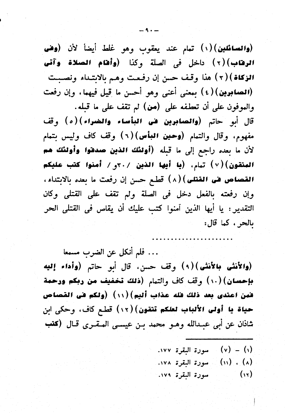 قال أبو حاتم {والصابرين في البأساء والضراء} وقف مفهوم، وقال والتمام {وحين البأس} وقف كاف وليس بتمام لأن ما بعده راجع إلى ما قبله {أولئك الذين صدقوا وأولئك هم المتقون} تمام، {يا أيها الذين آمنوا كتب عليكم القصاص في القتلى} قطع حسن إن رفعت ما بعده بالابتداء، وإن رفعته بالفعل دخل في الصلة ولم تقف على القتلى وكان التقدير: يا أيها الذين آمنوا كتب عليك أن يقاص في القتلى الحر بالحر، كما قال: