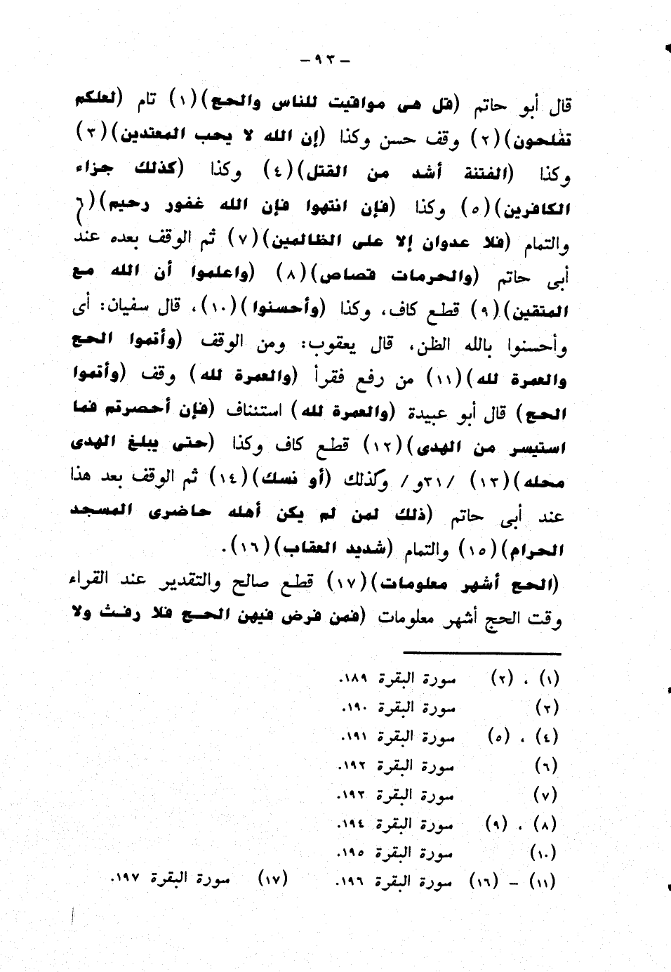 قال أبو حاتم {قل هي مواقيت للناس والحج} تام {لعلكم تفلحون} وقف حسن وكذا {إن الله لا يحب المعتدين} وكذا {الفتنة أشد من القتل} وكذا {كذلك جزاء الكافرين} وكذا {فإن انتهوا فإن الله غفور رحيم} والتمام {فلا عدوان إلا على الظالمين} ثم الوقف بعده عند أبي حاتم {والحرمات قصاص} {واعلموا أن الله مع المتقين} قطع كاف، وكذا {وأحسنوا}، قال سفيان: أي وأحسنوا بالله الظن، قال يعقوب: ومن الوقف {وأتموا الحج والعمرة لله} من رفع فقرأ (والعمرة لله) وقف (وأتموا الحج) قال أبو عبيدة (والعمرة لله) استئناف {فإن أحصرتم فما استيسر من الهدى} قطع كاف وكذا {حتى يبلغ الهدي محله} وكذلك {أو نسك} ثم الوقف بعد هذا عند أبي حاتم {ذلك لمن لم يكن أهله حاضري المسجد الحرام} والتمام {شديد العقاب}.