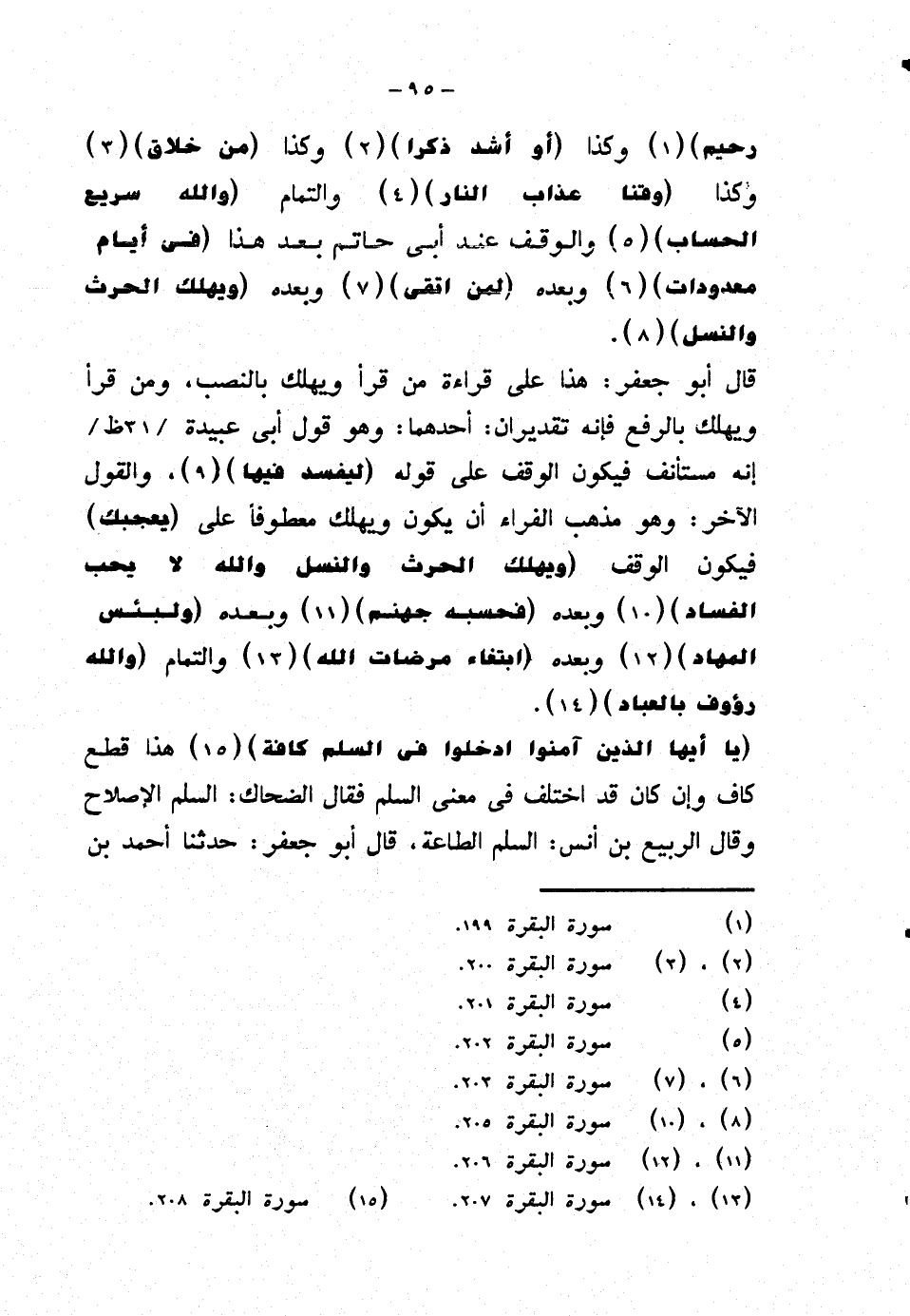 قال أبو جعفر: هذا على قراءة من قرأ ويهلك بالنصب، ومن قرأ ويهلك بالرفع فإنه تقديران: أحدهما: وهو قول أبي عبيدة إنه مستأنف فيكون الوقف على قوله {ليفسد فيها}، والقول الآخر: وهو مذهب الفراء أن يكون ويهلك معطوفًا على (يعجبك) فيكون الوقف {ويهلك الحرث والنسل والله لا يحب الفساد} وبعده {فحسبه جهنم} وبعده {ولبئس المهاد} وبعده {ابتغاء مرضات الله} والتمام {والله رؤوف بالعباد}.