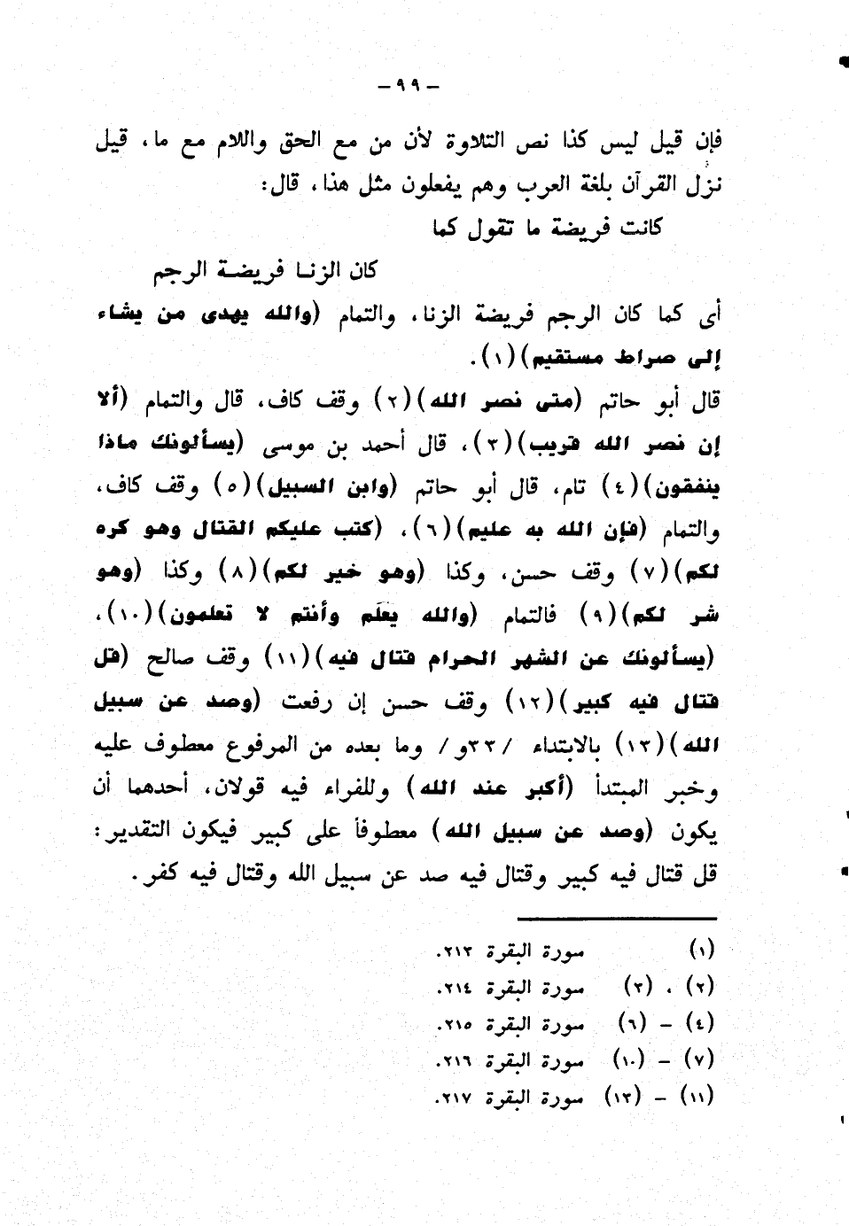 قال أبو حاتم {متى نصر الله} وقف كاف، قال والتمام {ألا إن نصر الله قريب}، قال أحمد بن موسى {يسألونك ماذا ينفقون} تام، قال أبو حاتم {وابن السبيل} وقف كاف، والتمام {فإن الله به عليم}، {كتب عليكم القتال وهو كره لكم} وقف حسن، وكذا {وهو خير لكم} وكذا {وهو شر لكم} فالتمام {والله يعلم وأنتم لا تعلمون}، {يسألونك عن الشهر الحرام قتال فيه} وقف صالح {قل قتال فيه كبير} وقف حسن إن رفعت {وصد عن سبيل الله} بالابتداء وما بعده من المرفوع معطوف عليه وخبر المبتدأ (أكبر عند الله) وللفراء فيه قولان، أحدهما أن يكون (وصد عن سبيل الله) معطوفًا على كبير فيكون التقدير: قل قتال فيه كبير وقتال فيه صد عن سبيل الله وقتال فيه كفر.