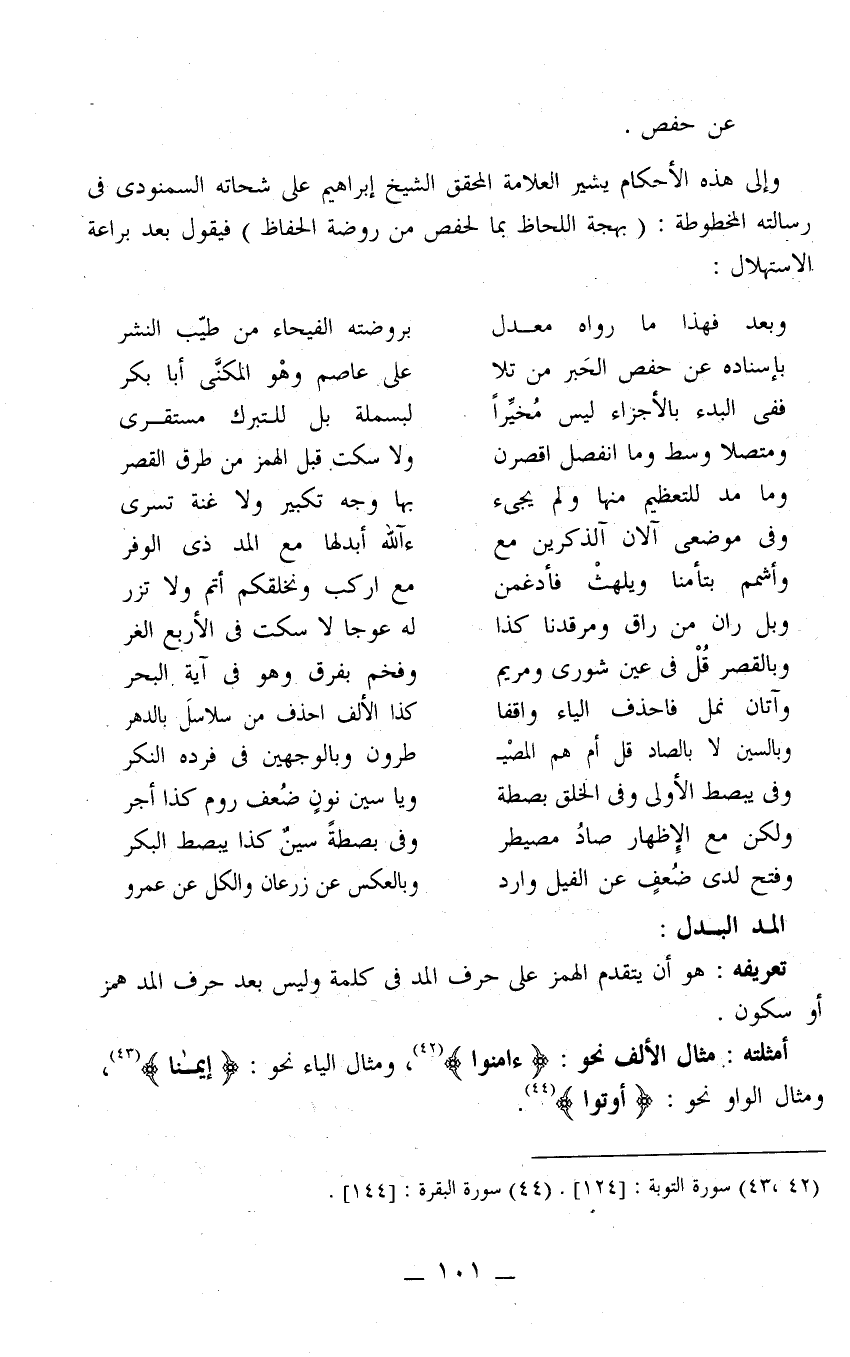 وإلى هذه الأحكام يشير العلامة المحقق الشيخ إبراهيم على شحاتة السمنودي في رسالته المخطوطة: "بهجة اللِّحاظ بما لحفص من روضة الحفاظ" فيقول بعد براعة الاستهلال: