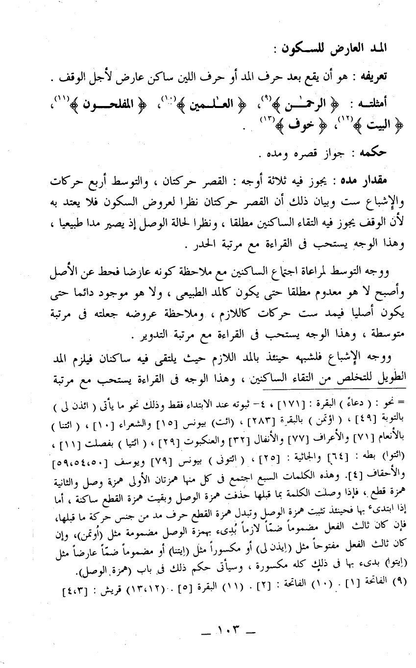 أمثلتُهُ: {الرَّحْمَنُ} 1، {الْعَالَمِينَ} 2، {الْمُفْلِحُونَ} 3، {الْبَيْتِ} 4، {خَوفٍ} 5