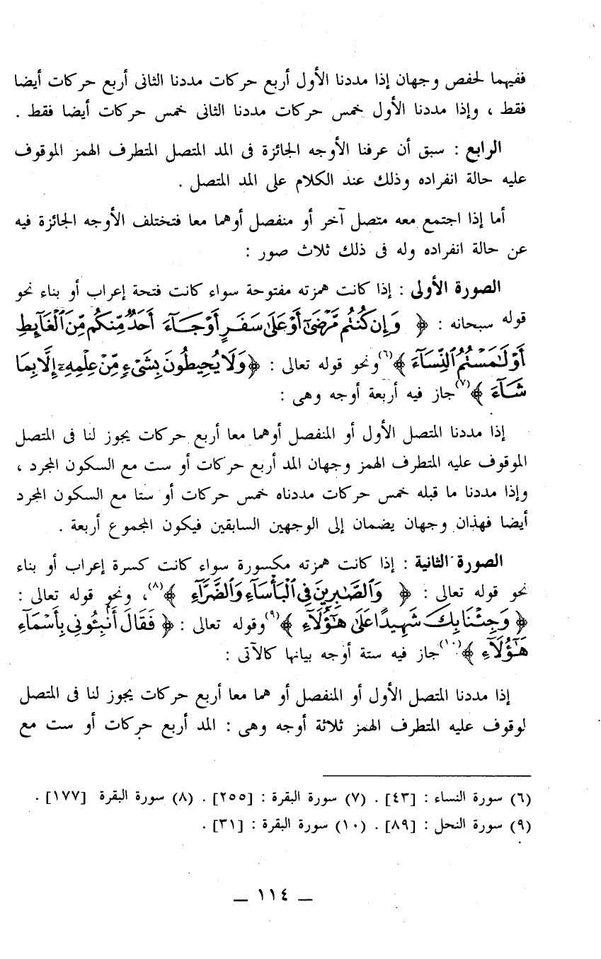 إذا كانت همزته مكسورة سواء كانت كسرة إعراب أو بناء نحو قوله تعالى: {وَالصَّابِرِينَ فِي الْبَأْسَاءِ وَالضَّرَّاءِ} 3، ونحو قوله تعالى: {وَجِئْنَا بِكَ شَهِيدًا عَلَى هَؤُلاءِ} 4 وقوله تعالى: {فَقَالَ أَنْبِئُونِي بِأَسْمَاءِ هَؤُلاءِ} 5 جاز فيه ستة أوجه بيانها كالآتي: