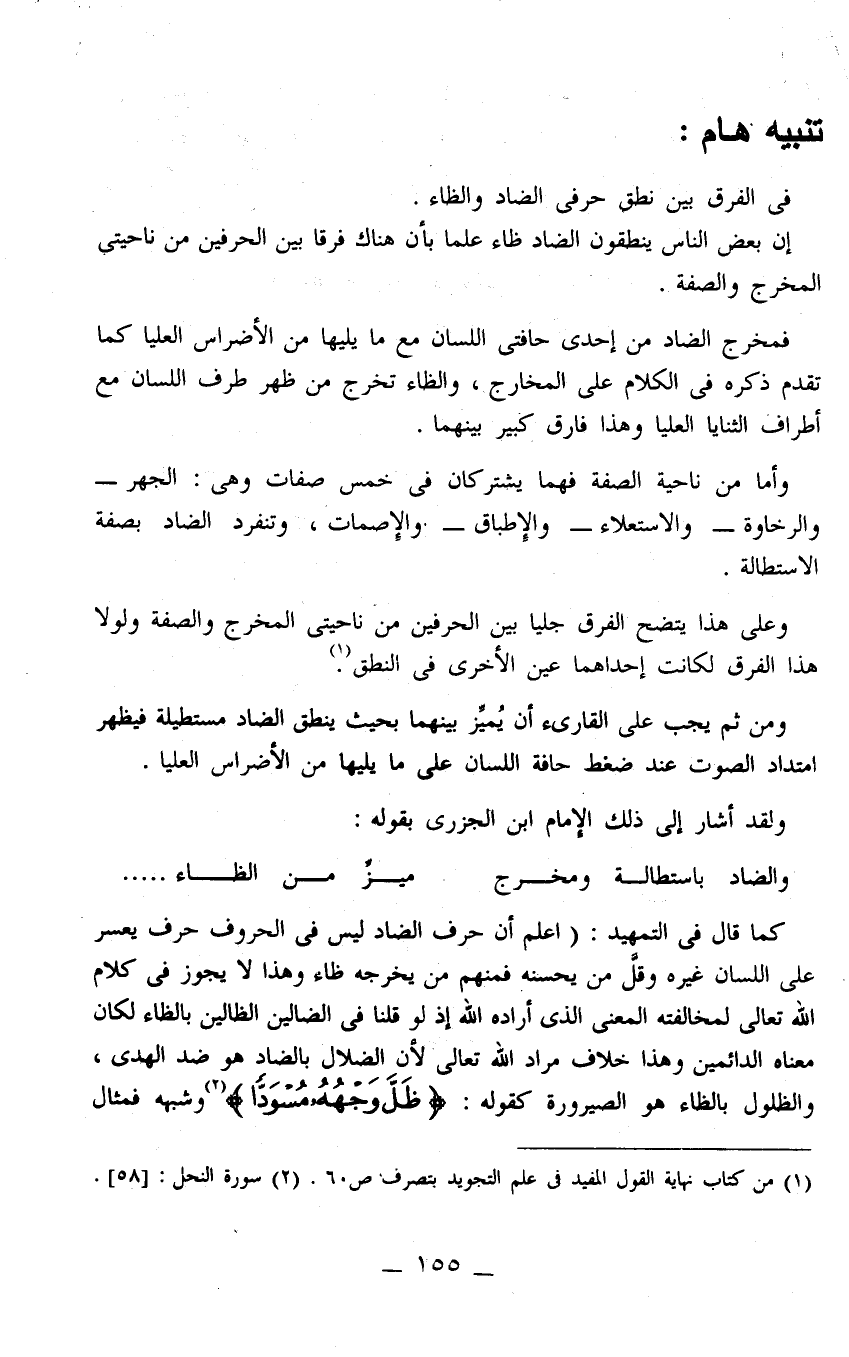 كما قال في التمهيد: "اعلم أن حرف الضاد ليس في الحروف حرف يعسر على اللسان غيره، وقَلَّ من يحسنه، فمنهم من يخرجه ظاء وهذا لا يجوز في كلام الله تعالى؛ لمخالفته المعنى الذي أراده الله، إذ لو قلنا في: الضالين، الظالين -بالظاء- لكان معناه الدائمين، وهذا خلاف مراد الله تعالى؛ لأن الضلال بالضاد هو ضد الهدى، والظلول بالظاء هو الصيرورة كقوله: {ظَلَّ وَجْهُهُ مُسْوَدًّا} 2 وشبهه فمثال