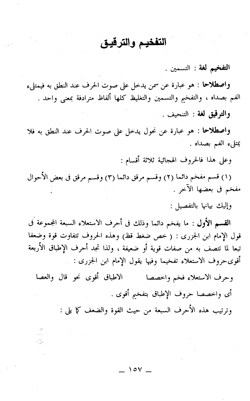 ما يفخم دائمًا: وذلك في أحرف الاستعلاء السبعة المجموعة في قول الإمام ابن الجزري: خص ضغط قظ، وهذه الحروف تتفاوت قوة وضعفًا تبعًا لما تتصف به من صفات قوية أو ضعيفة، لذا تجد أحرف الإطباق الأربعة أقوى حروف الاستعلاء تفخيمًا وفيها يقول الإمام ابن الجزري:
