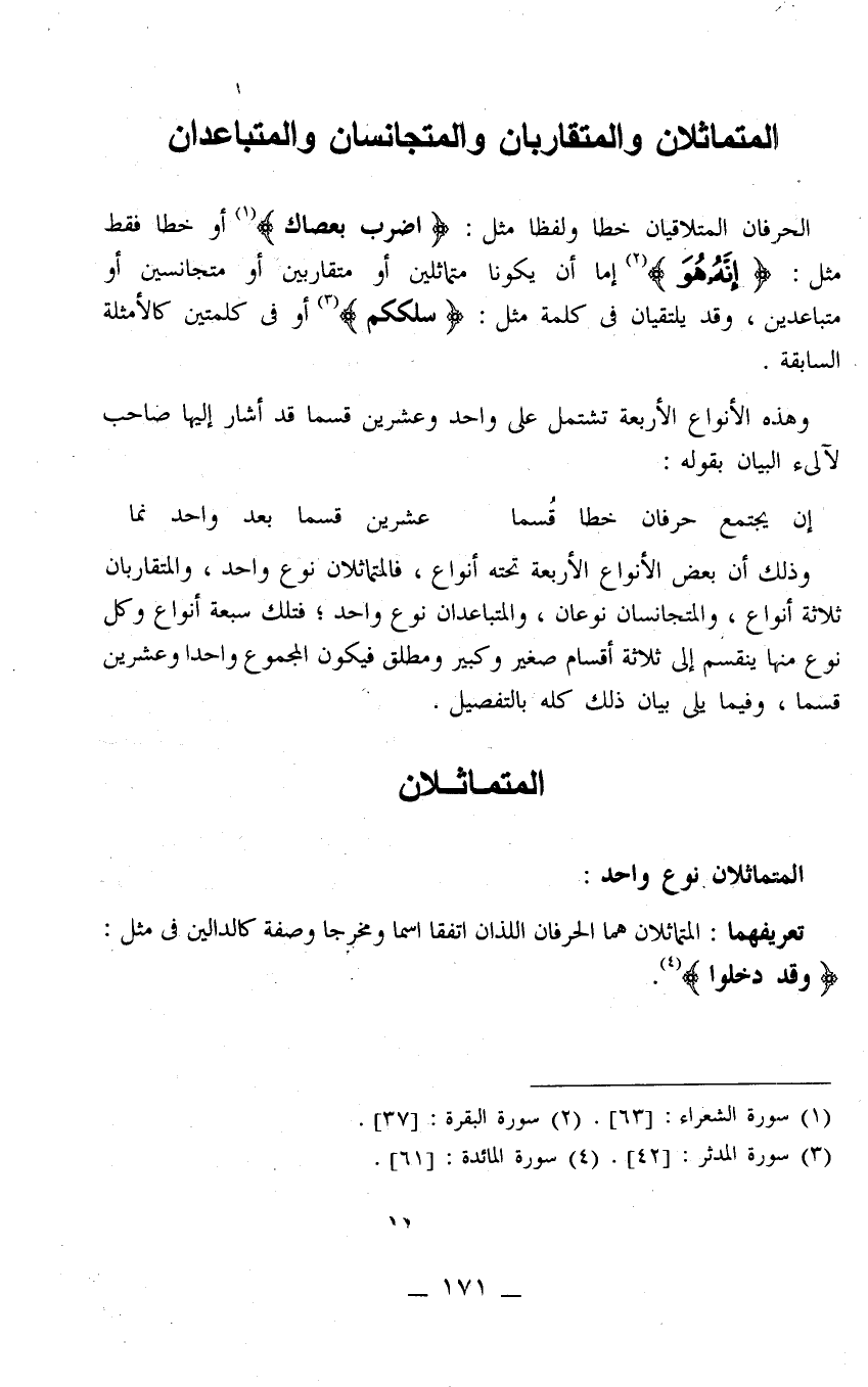 تعريفهما: المتماثلان هما الحرفان اللذان اتفقا اسمًا ومخرجًا وصفة كالدَّالين في مثل: {وَقَدْ دَخَلُوا} 1.