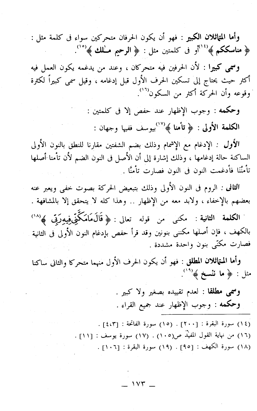 وأما المتماثلان المطلق: فهو أن يكون الحرف الأول منهما متحركًا والثاني ساكنًا مثل: {مَا نَنْسَخْ} 6.