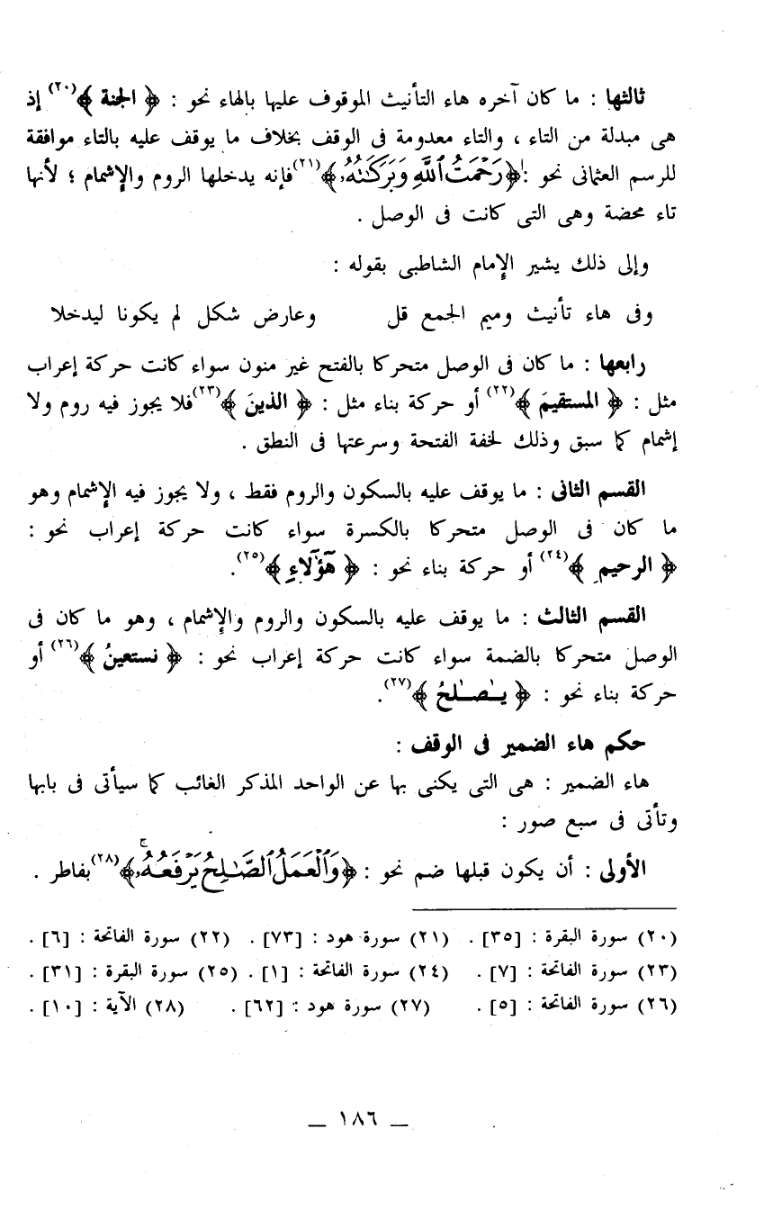 ثالثها: ما كان آخره هاء التأنيث الموقوف عليها بالهاء نحو: {الْجَنَّةَ} 1 إذ هي مبدلة من التاء، والتاء معدومة في الوقف بخلاف ما يوقف عليه بالتاء موافقة للرسم العثماني نحو: {رَحْمَتُ اللَّهِ وَبَرَكَاتُهُ} 2 فإنه يدخلها الروم والإشمام؛ لأنها تاء محضة وهي التي كانت في الوصل. وإلى ذلك يشير الإمام الشاطبي بقوله: