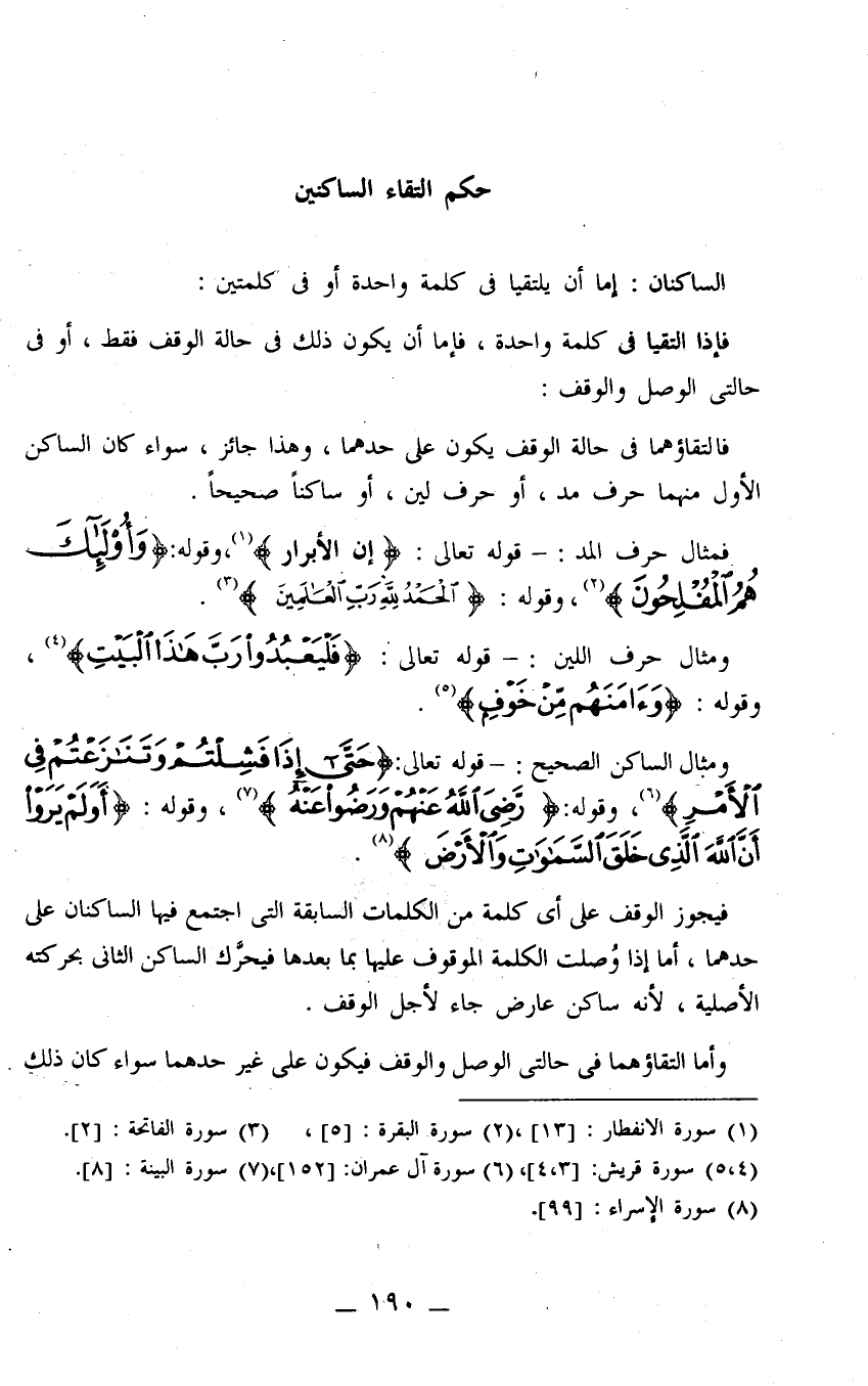 فالتقاؤهما في حالة الوقف يكون على حدهما، وهذا جائز، سواء كان الساكن الأول منهما حرف مد، أو حرف لين، أو ساكنًا صحيحًا.