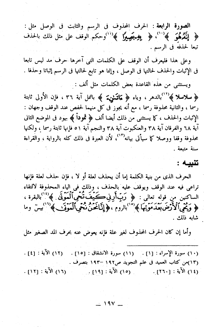 الصورة الرابعة: الحرف المحذوف في الرسم والثابت في الوصل مثل: {إِنَّهُ هُوَ} 1، {بِهِ بَصِيرًا} 2 وحكم الوقف على ذلك بالحذف تبعًا لحذفه في الرسم.