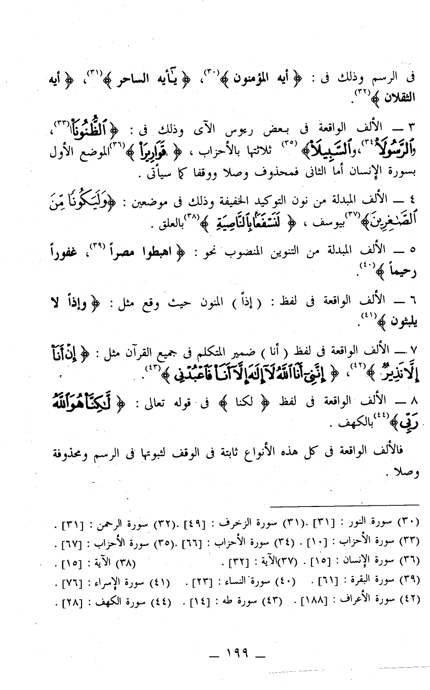 3- الألف الواقعة في بعض رءوس الآي وذلك في: {الظُّنُونَاْ} 4، و {الرَّسُولَاْ} 5، {السَّبِيلِاْ} 6 ثلاثتها بالأحزاب، {قَوَارِيرَاْ} 7 الموضع الأول بسورة الإنسان أما الثاني فمحذوف وصلا ووقفًا كما سيأتي.
