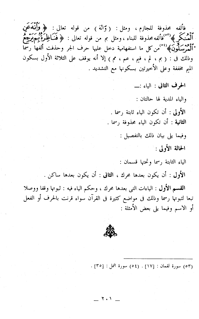 فألِفُهُ محذوفة للجازم، ومثل: "وَانْهَ" من قوله تعالى: {وَانْهَ عَنِ الْمُنْكَرِ} 1 فألفه محذوفة للبناء، ومثل "بِمَ" من قوله تعالى: {فَنَاظِرَةٌ بِمَ يَرْجِعُ الْمُرْسَلُونَ} 2 من كل "ما" استفهامية دخل عليها حرف الجر وحذفت ألفها رسْمًا وذلك في: "بِمَ، لِمَ، فيمَ، عَمَّ، مِمَّ" إلا أنه يوقف على الثلاثة الأُوَل بسكون الميم مخففة، وعلى الأخيرتين بسكونها مع التشديد.