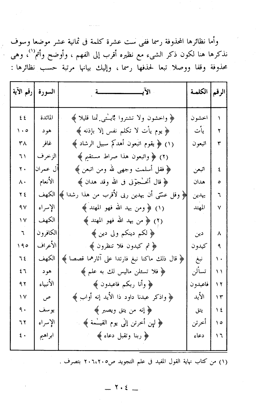 وأما نظائرها المحذوفة رسْمًا ففي ست عشرة كلمة في ثمانية عشر موضعًا وسوف نذكرها هنا لكون ذكر الشيء مع نظيره أقرب إلى الفَهْم، وأوضح وأتمَّ1، وهي محذوفة وقفًا ووصلا تبعًا لحذفها رسْمًا، وإليك بيانها مرتبة حسب نظائرها: