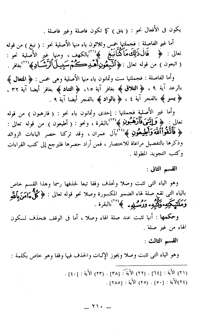 وأما غير الأصلية فجملتها: إحدى وثمانون ياء نحو: "فارهبون" من قوله تعالى: {وَإِيَّايَ فَارْهَبُونِ} 3 بالبقرة، ونحو: "أطيعون" من قوله تعالى: {فَاتَّقُوا اللَّهَ وَأَطِيعُونِ} 4 بآل عمران، وقد تركنا حصر الياءات الزوائد وذكرها بالتفصيل مراعاة للاختصار، فمن أراد حصرها فليرجع إلى كتب القراءات وكتب التجويد المطوَّلة.