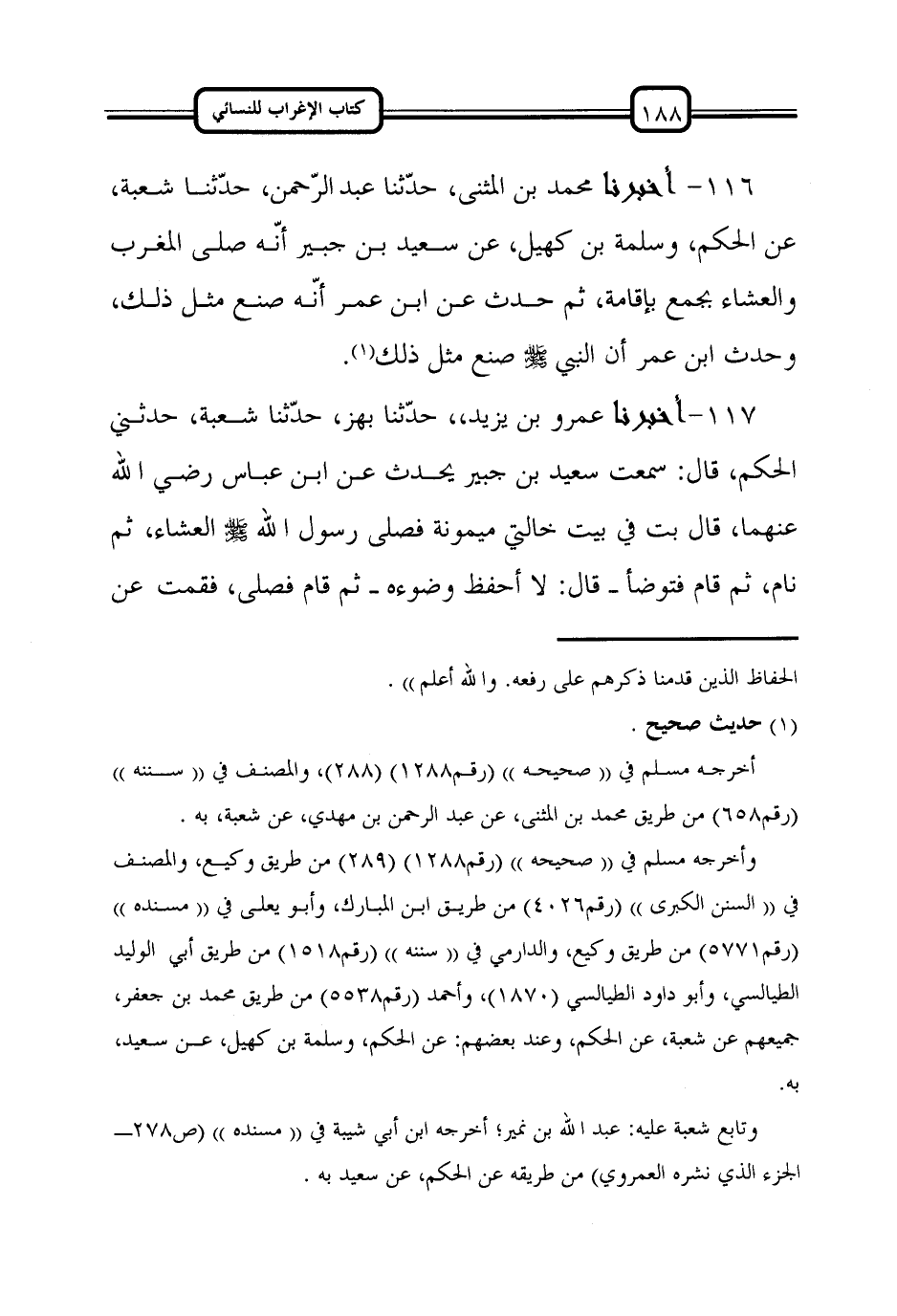 116 - أَخْبَرَنَا مُحَمَّدُ بْنُ الْمُثَنَّى، حَدَّثَنَا عَبْدُ الرَّحْمَنِ، حَدَّثَنَا شُعْبَةُ، عَنِ الْحَكَمِ، وَسَلَمَةَ بْنِ كُهَيْلٍ، عَنْ سَعِيدِ بْنِ جُبَيْرٍ أَنَّهُ صَلَّى الْمَغْرِبَ والعشاء بجمع بإقامة، ثم حدت عَنِ ابْنِ عُمَرَ أَنَّهُ صَنَعَ مِثْلَ ذَلِكَ، وَحَدَّثَ ابْنُ عُمَرَ أَنَّ النَّبِيَّ صَلَّى اللَّهُ عَلَيْهِ وَسَلَّمَ صَنَعَ مِثْلَ ذَلِكَ.