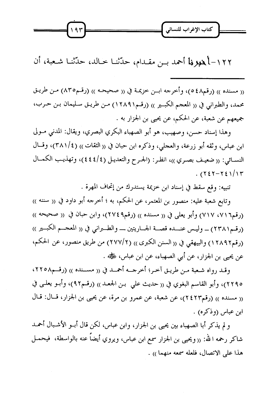 122 - أَخْبَرَنَا أَحْمَدُ بْنُ مِقْدَامٍ، حَدَّثَنَا خَالِدٌ، حَدَّثَنَا شُعْبَةُ، أَنَّ -[194]- الْحَكَمَ أَخْبَرَهُ، قَالَ: سَمِعْتُ يَحْيَى -وَهُوَ ابْنُ الْجَزَّارِ- يُحَدِّثُ عَنْ صُهَيْبٍ -وَهُوَ رَجُلٌ مِنْ أَهْلِ الْبَصْرَةِ- قَالَ: سَمِعْتُ ابْنَ عَبَّاسٍ يُحَدِّثُ أَنَّهُ مَرَّ بَيْنَ يَدَيْ رَسُولِ اللَّهِ صَلَّى اللَّهُ عَلَيْهِ وَسَلَّمَ هُوَ وَغُلامٌ مِنْ بَنِي هَاشِمٍ عَلَى حِمَارٍ بَيْنَ يَدَيْ رَسُولِ اللَّهِ صَلَّى اللَّهُ عَلَيْهِ وَسَلَّمَ وَهُوَ يُصَلِّي، فَنَزَلُوا ثُمَّ دَخَلُوا مَعَهُ فَصَلَّوْا فَلَمْ يَنْصَرِفْ، وَجَاءَتْ جَارِيَتَانِ تَسْعَيَانِ مِنْ بَنِي عَبْدِ الْمُطَّلِبِ، فَأَخَذَتَا بِرُكْبَتَيْهِ فَقَرَعَ بَيْنَهُمَا وَلَمْ يَنْصَرِفْ.