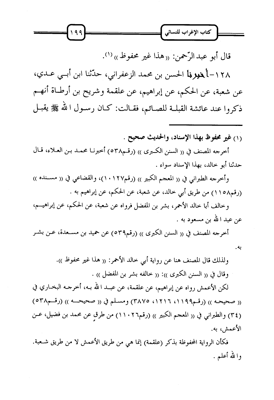 128 - أَخْبَرَنَا الْحَسَنُ بْنُ مُحَمَّدٍ الزَّعْفَرَانِيُّ، حَدَّثَنَا ابْنُ أَبِي عَدِيٍّ، عَنْ شُعْبَةَ، عَنِ الْحَكَمِ، عَنْ إِبْرَاهِيمَ، عَنْ عَلْقَمَةَ وَشُرَيْحِ بْنِ أَرْطَاةَ أَنَّهُمْ ذَكَرُوا عِنْدَ عَائِشَةَ الْقُبْلَةَ لِلصَّائِمِ، فَقَالَتْ: كَانَ رَسُولُ اللَّهِ صَلَّى اللَّهُ عَلَيْهِ وَسَلَّمَ يُقَبِّلُ -[200]- وَهُوَ صَائِمٌ، وَيُبَاشِرُ وَهُوَ صَائِمٌ، وَكَانَ أَمْلَكَ لإِرْبِهِ مِنْكُمْ، صَلَّى اللَّهُ عَلَيْهِ وَسَلَّمَ.
