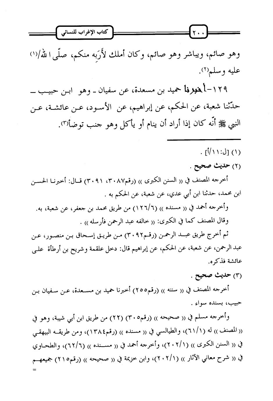 129 - أَخْبَرَنَا حُمَيْدُ بْنُ مَسْعَدَةَ، عَنْ سُفْيَانَ -وَهُوَ ابْنُ حَبِيبٍ- حَدَّثَنَا شُعْبَةُ، عَنِ الْحَكَمِ، عَنْ إِبْرَاهِيمَ، عَنِ الأَسْوَدِ، عَنْ عَائِشَةَ، عَنِ النَّبِيِّ صَلَّى اللَّهُ عَلَيْهِ وَسَلَّمَ أَنَّهُ كَانَ إِذَا أَرَادَ أَنْ يَنَامَ أَوْ يَأْكُلَ وَهُوَ جُنُبٌ توضأ.