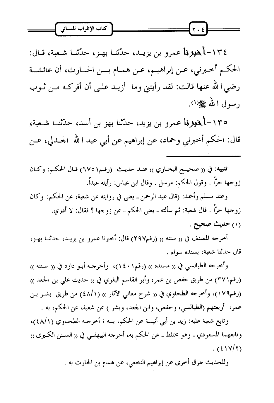 134 - أَخْبَرَنَا عَمْرُو بْنُ يَزِيدَ، حَدَّثَنَا بَهْزٌ، حَدَّثَنَا شُعْبَةُ، قَالَ: الْحَكَمُ أَخْبَرَنِي، عَنْ إِبْرَاهِيمَ، عَنْ هَمَّامِ بْنِ الْحَارِثِ، أَنَّ عَائِشَةَ رَضِيَ اللَّهُ عَنْهَا قَالَتْ: لَقَدْ رَأَيْتُنِي وَمَا أَزِيدُ عَلَى أَنْ أَفْرُكَهُ مِنْ ثَوْبِ رَسُولِ اللَّهِ صَلَّى اللَّهُ عَلَيْهِ وَسَلَّمَ.