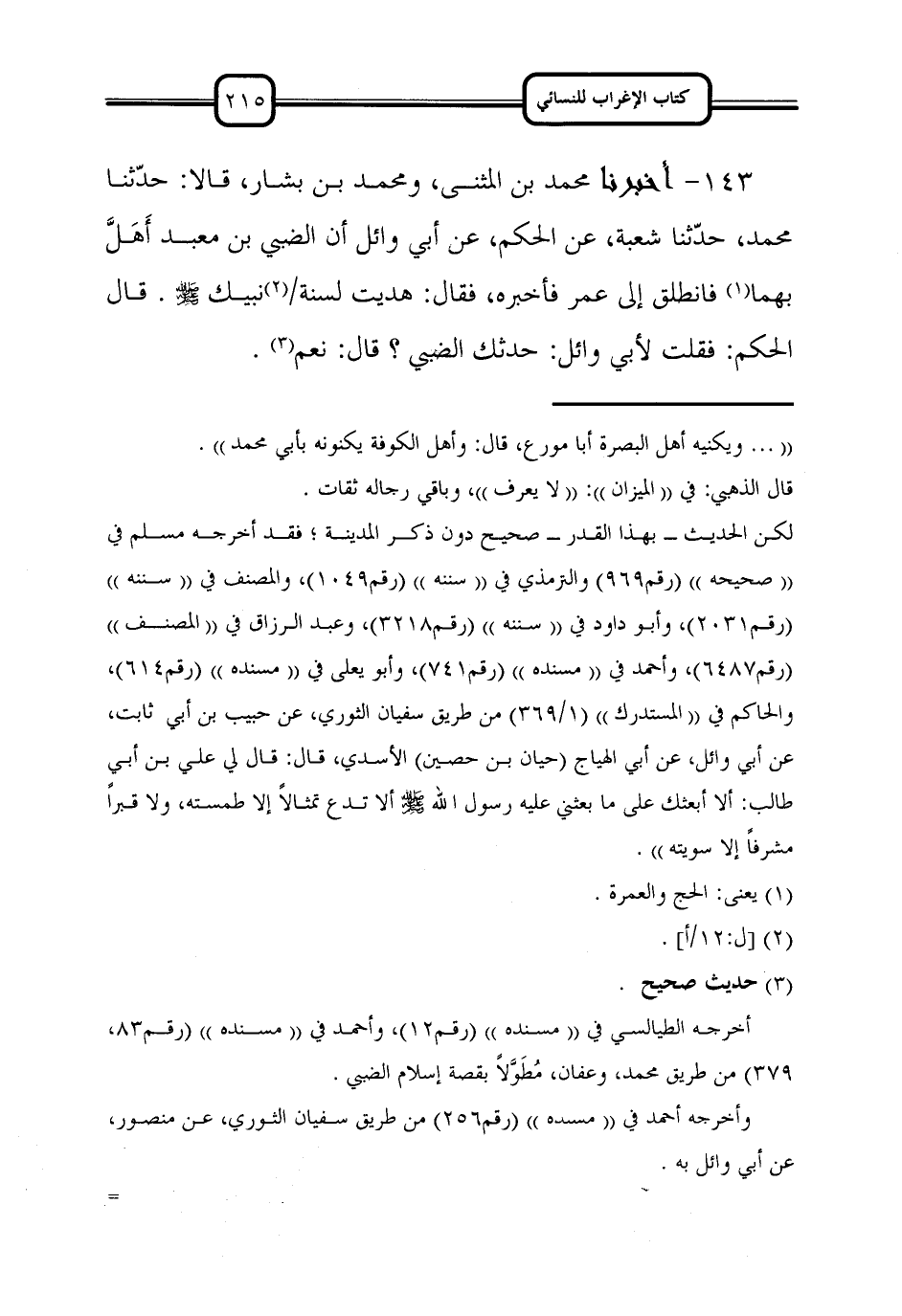 143 - أَخْبَرَنَا مُحَمَّدُ بْنُ الْمُثَنَّى، وَمُحَمَّدُ بْنُ بَشَّارٍ، قَالا: حَدَّثَنَا مُحَمَّدٌ، حَدَّثَنَا شُعْبَةُ، عَنِ الْحَكَمِ، عَنْ أَبِي وَائِلٍ أَنَّ الضَّبِّيَّ بْنَ مَعْبَدٍ أَهَلَّ بِهِمَا فَانْطَلَقَ إِلَى عُمَرَ فَأَخْبَرَهُ، فَقَالَ: هُدِيتَ لِسُنَّةِ نَبِيِّكَ صَلَّى اللَّهُ عَلَيْهِ وَسَلَّمَ. قال الحكم: فقلت لأبي وائل: حدثك الضَّبِّيَّ؟ قَالَ: نَعَمْ.