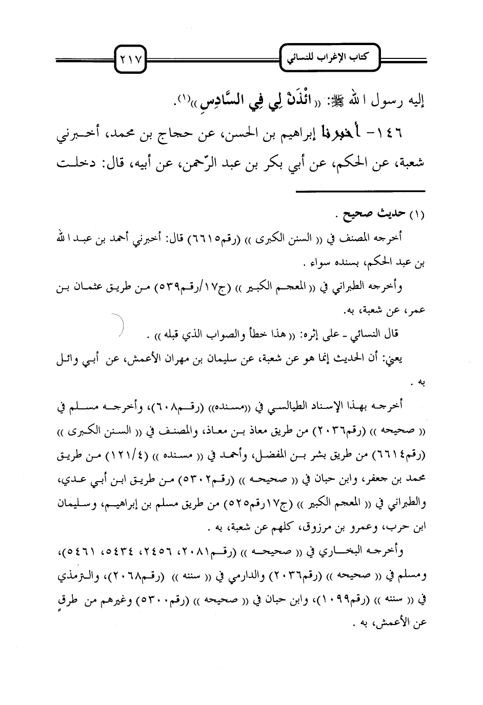 146 - أَخْبَرَنَا إِبْرَاهِيمُ بْنُ الْحَسَنِ، عَنْ حَجَّاجِ بْنِ مُحَمَّدٍ، أَخْبَرَنِي شُعْبَةُ، عَنِ الْحَكَمِ، عَنْ أَبِي بَكْرِ بْنِ عَبْدِ الرَّحْمَنِ، عَنْ أَبِيهِ، قَالَ: دَخَلْتُ -[218]- عَلَى عَائِشَةَ رَضِيَ اللَّهُ عَنْهَا، فَقَالَتْ: كَانَ رَسُولُ اللَّهِ صَلَّى اللَّهُ عَلَيْهِ وَسَلَّمَ يُصْبِحُ جُنُبًا، ثُمَّ يَغْدُو إِلَى الْمَسْجِدِ، وَرَأْسُهُ يَقْطُرُ، ثُمَّ يَصُومُ، فَأَخْبَرْتُ مَرْوَانَ بِقَوْلِهَا فَقَالَ لِي: أَخْبِرْ أَبَا هُرَيْرَةَ بِقَوْلِ عَائِشَةَ. فَقُلْتُ: إِنَّهُ صَدِيقٌ لِي فَأُحِبُّ أَنْ تَعْفِيَنِي، فَقَالَ: عَزَمْتُ عَلَيْكَ لَمَا انْطَلَقْتَ إِلَيْهِ. قَالَ أَبُو بَكْرٍ: فَانْطَلَقْتُ أَنَا وَهُوَ إِلَى أَبِي هُرَيْرَةَ رَضِيَ اللَّهُ عَنْهُ فَأَخْبَرْتُهُ بِقَوْلِهَا. فَقَالَ: عَائِشَةُ أَعْلَمُ بِرَسُولِ اللَّهِ صَلَّى اللَّهُ عَلَيْهِ وَسَلَّمَ.