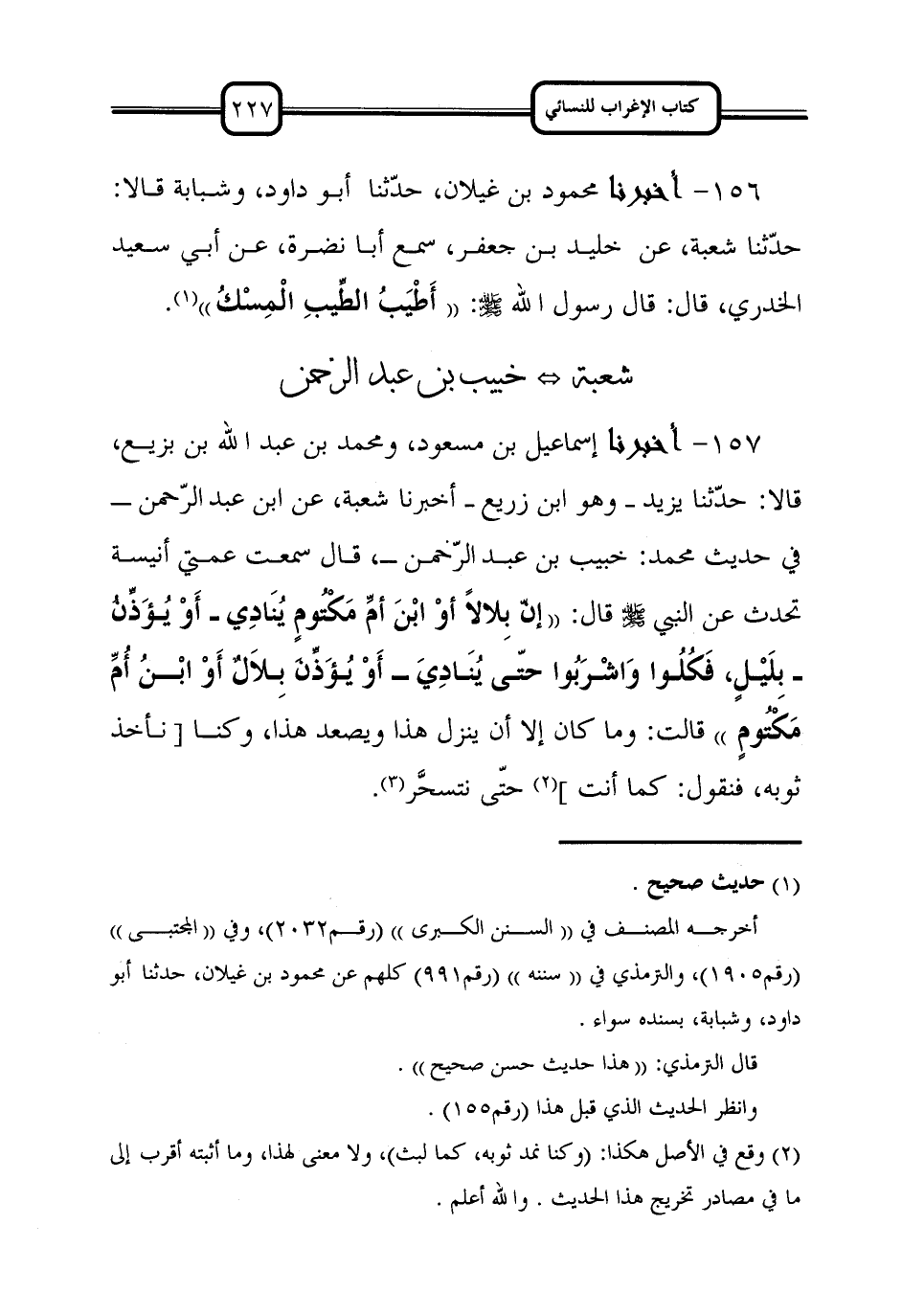 156 - أَخْبَرَنَا مَحْمُودُ بْنُ غَيْلانَ، حَدَّثَنَا أَبُو دَاوُدَ، وَشَبَابَةُ قَالا: حَدَّثَنَا شُعْبَةُ، عَنْ خُلَيْدِ بْنِ جَعْفَرٍ، سَمِعَ أَبَا نَضْرَةَ، عَنْ أَبِي سَعِيدٍ الْخُدْرِيِّ، قَالَ: قَالَ رَسُولُ اللَّهِ صَلَّى اللَّهُ عَلَيْهِ وَسَلَّمَ: ((أَطْيَبُ الطِّيبِ الْمِسْكُ)).