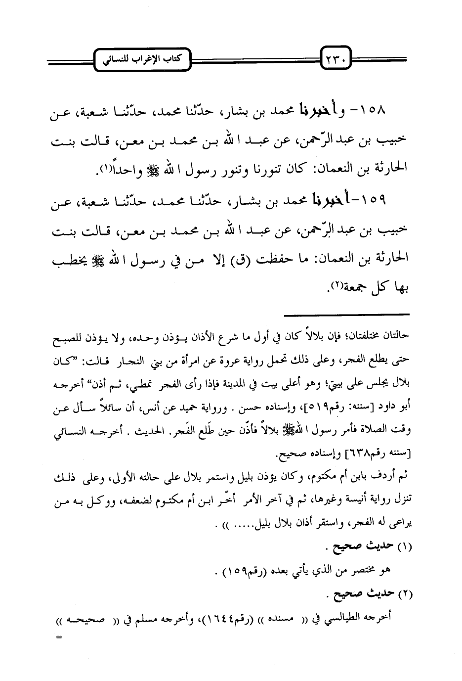 158 - وَأَخْبَرَنَا مُحَمَّدُ بْنُ بَشَّارٍ، حَدَّثَنَا مُحَمَّدٌ، حَدَّثَنَا شُعْبَةُ، عَنْ خُبَيْبِ بْنِ عَبْدِ الرَّحْمَنِ، عَنْ عَبْدِ اللَّهِ بْنِ مُحَمَّدِ بْنِ مَعْنٍ، قَالَتْ بِنْتُ الْحَارِثَةِ بْنِ النُّعْمَانِ: كَانَ تَنُّورُنَا وَتَنُّورُ رَسُولِ اللَّهِ صَلَّى اللَّهُ عَلَيْهِ وَسَلَّمَ وَاحِدًا.