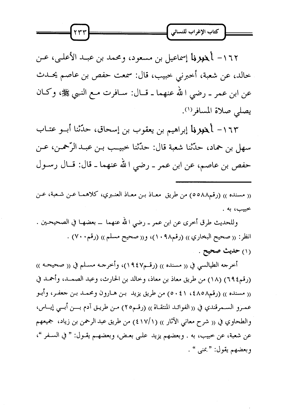 162 - أَخْبَرَنَا إِسْمَاعِيلُ بْنُ مَسْعُودٍ، وَمُحَمَّدُ بْنُ عَبْدِ الأَعْلَى، عَنْ خَالِدٍ، عَنْ شُعْبَةَ، أَخْبَرَنِي خُبَيْبٌ، قَالَ: سَمِعْتُ حَفْصَ بْنَ عَاصِمٍ يُحَدِّثُ عَنِ ابْنِ عُمَرَ - رَضِيَ اللَّهُ عَنْهُمَا- قَالَ: سَافَرْتُ مَعَ النَّبِيِّ صَلَّى اللَّهُ عَلَيْهِ وَسَلَّمَ، وَكَانَ يُصَلِّي صَلاةَ الْمُسَافِرِ)).