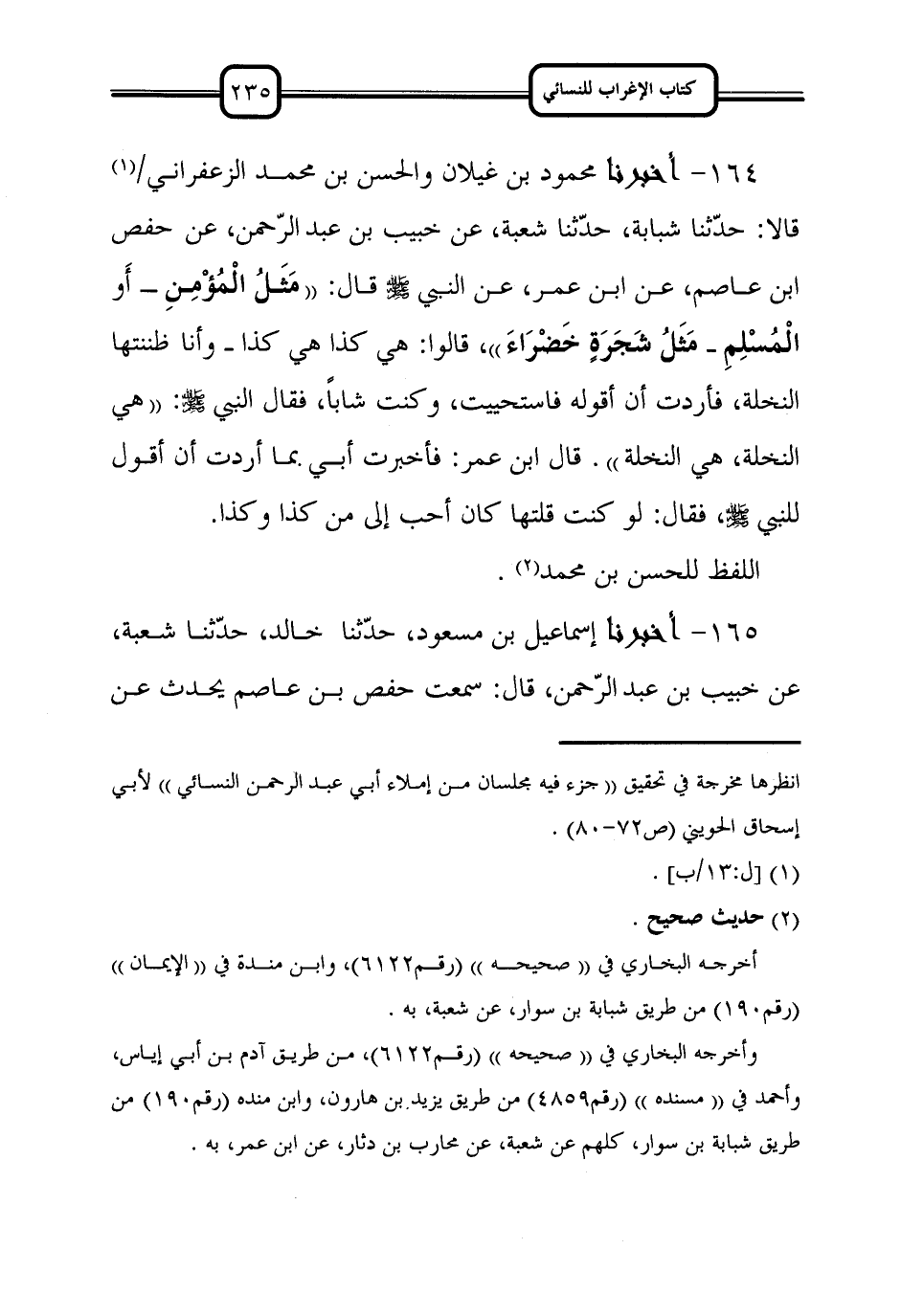 164 - أَخْبَرَنَا مَحْمُودُ بْنُ غَيْلانَ وَالْحَسَنُ بْنُ مُحَمَّدٍ الزَّعْفَرَانِيُّ قَالا: حَدَّثَنَا شَبَابَةُ، حَدَّثَنَا شُعْبَةُ، عَنْ خبيب بن عبد الرحمن، عن حفص ابن عَاصِمٍ، عَنِ ابْنِ عُمَرَ، عَنِ النَّبِيِّ صَلَّى اللَّهُ عَلَيْهِ وَسَلَّمَ قَالَ: ((مَثَلُ الْمُؤْمِنِ -أَوِ الْمُسْلِمِ- مَثَلُ شجرةٍ خَضْرَاءَ)، قَالُوا: هِيَ كَذَا هِيَ كَذَا - وَأَنَا ظَنَنْتُهَا النَّخْلَةَ، فَأَرَدْتُ أَنْ أَقُولَهُ فَاسْتَحْيَيْتُ، وَكُنْتُ شَابًّا، فَقَالَ النَّبِيُّ صَلَّى اللَّهُ عَلَيْهِ وَسَلَّمَ: ((هِيَ النَّخْلَةُ، هِيَ النَّخْلَةُ)). قَالَ ابْنُ عُمَرَ: فَأَخْبَرْتُ أَبِي بِمَا أَرَدْتُ أَنْ أَقُولَ لِلنَّبِيِّ صَلَّى اللَّهُ عَلَيْهِ وَسَلَّمَ، فَقَالَ: لَوْ كُنْتَ قُلْتَهَا كَانَ أَحَبَّ إِلَيَّ مِنْ كَذَا وَكَذَا.