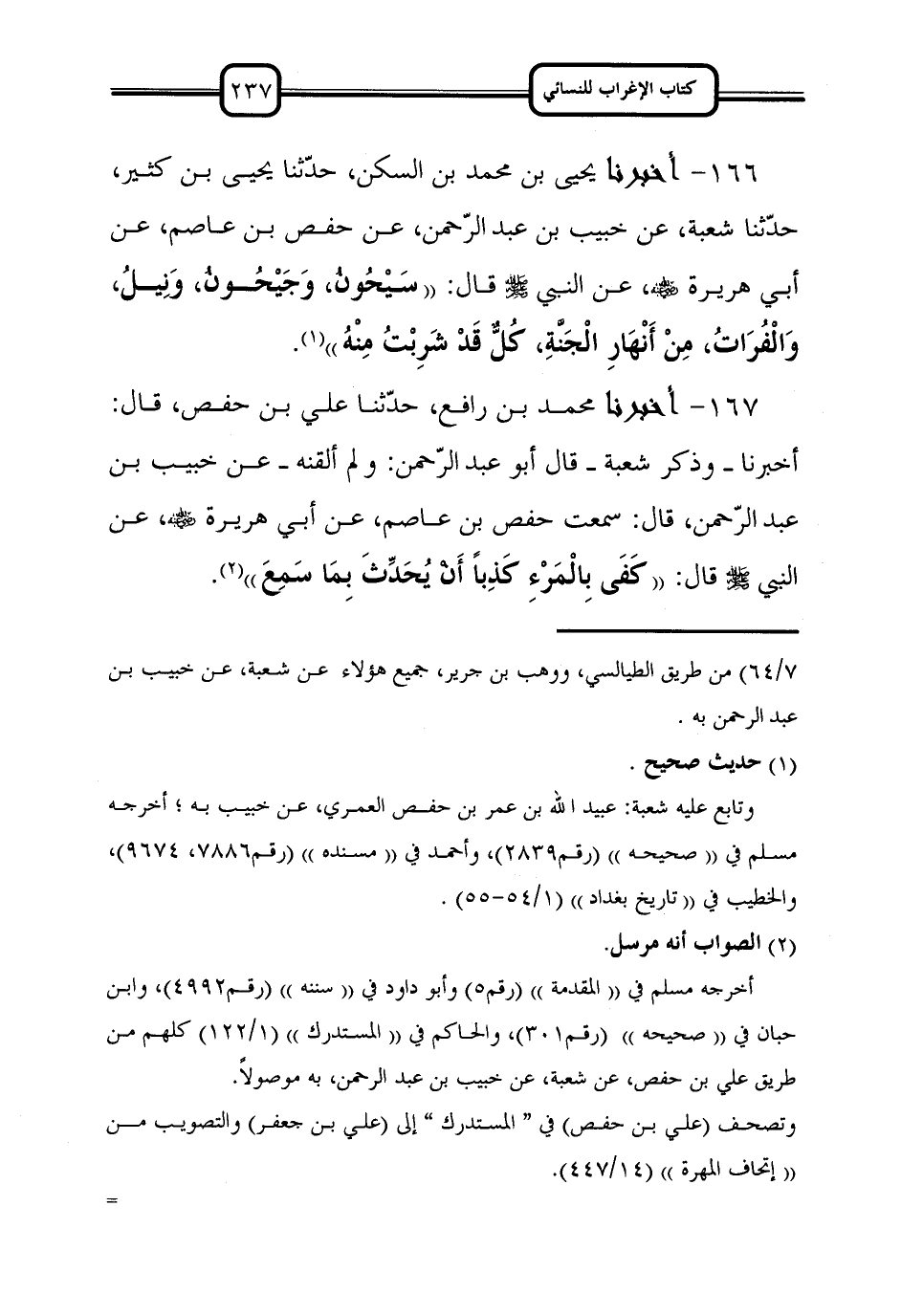 166 - أَخْبَرَنَا يَحْيَى بْنُ مُحَمَّدِ بْنِ السَّكَنِ، حَدَّثَنَا يَحْيَى بْنُ كَثِيرٍ، حَدَّثَنَا شُعْبَةُ، عَنْ خُبَيْبِ بْنِ عَبْدِ الرَّحْمَنِ، عَنْ حَفْصِ بْنِ عَاصِمٍ، عَنْ أَبِي هُرَيْرَةَ رَضِيَ اللَّهُ عَنْهُ، عَنِ النَّبِيِّ صَلَّى اللَّهُ عَلَيْهِ وَسَلَّمَ قَالَ: ((سَيْحُونُ، وَجَيْحُونُ، وَنِيلٌ، وَالْفُرَاتُ، مِنْ أَنْهَارِ الْجَنَّةِ، كلٌّ قَدْ شَرِبْتُ مِنْهُ)).