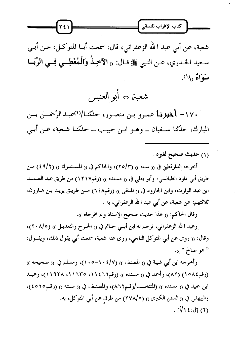 170 - أَخْبَرَنَا عَمْرُو بْنُ مَنْصُورٍ، حَدَّثَنَا عَبْدُ الرَّحْمَنِ بْنُ الْمُبَارَكِ، حَدَّثَنَا سُفْيَانُ -وَهُوَ ابْنُ حَبِيبٍ- حَدَّثَنَا شُعْبَةُ، عَنْ أَبِي -[242]- الْعَنْبَسِ، عَنْ أَبِي الشَّعْثَاءِ، عَنِ ابْنِ عَبَّاسٍ رَضِيَ اللَّهُ عَنْهُمَا، أَنَّ النَّبِيَّ صَلَّى اللَّهُ عَلَيْهِ وَسَلَّمَ جَعَلَ فِدَاءَ أَهْلِ الْجَاهِلِيَّةِ يَوْمَ بدر أربعمائة.