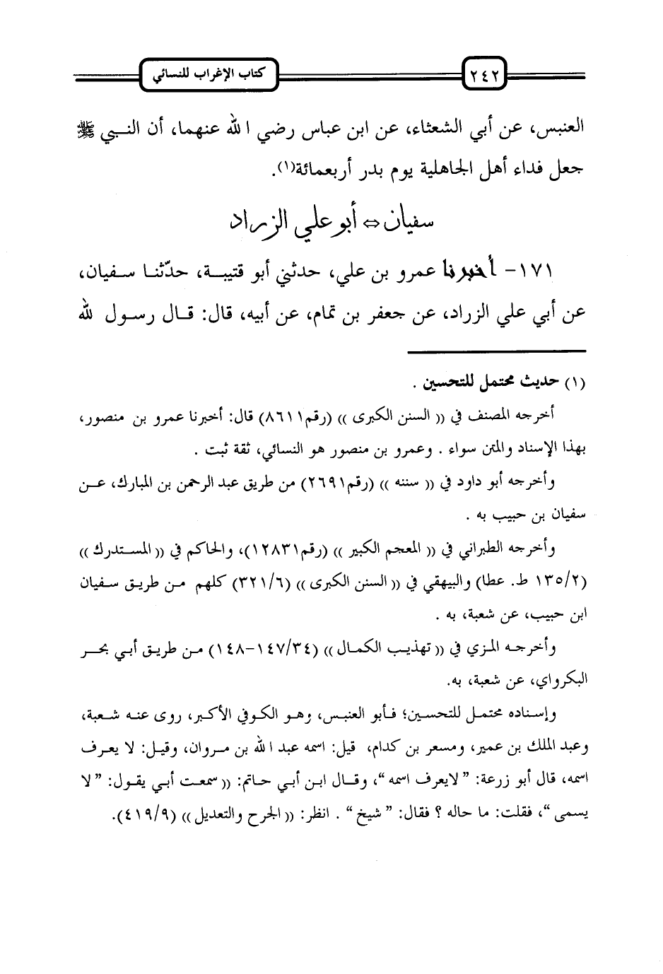 171 - أَخْبَرَنَا عَمْرُو بْنُ علي، حدثني أبو قُتَيْبَةَ، حَدَّثَنَا سُفْيَانُ، عَنْ أَبِي عَلِيٍّ الزَّرَّادُ، عَنْ جَعْفَرِ بْنِ تَمَّامٍ، عَنْ أَبِيهِ، قَالَ: قَالَ رَسُولُ اللَّهِ -[243]- صَلَّى اللَّهُ عَلَيْهِ وَسَلَّمَ: ((مَا لَكُمْ تَأْتُونِي قُلْحًا لا تَسْتَاكُونَ، اسْتَاكُوا)).