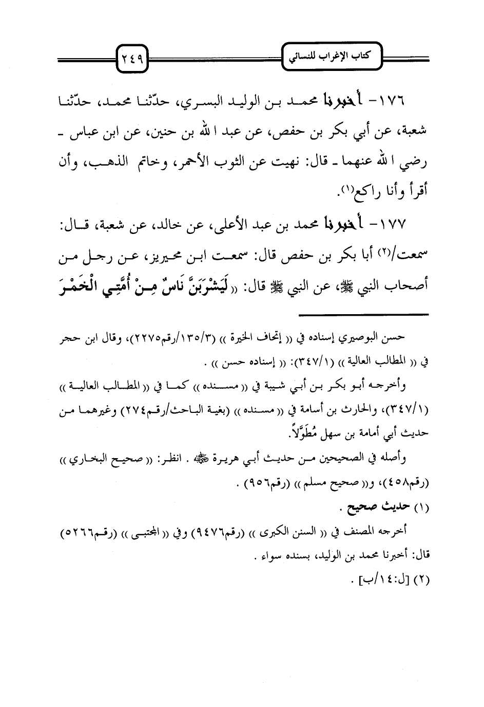 177 - أَخْبَرَنَا مُحَمَّدُ بْنُ عَبْدِ الأَعْلَى، عَنْ خَالِدٍ، عَنْ شُعْبَةَ، قَالَ: سَمِعْتُ أَبَا بَكْرِ بْنَ حَفْصٍ قَالَ: سَمِعْتُ ابْنَ مُحَيْرِيزٍ، عَنْ رَجُلٍ مِنْ أَصْحَابِ النَّبِيِّ صَلَّى اللَّهُ عَلَيْهِ وَسَلَّمَ، عَنِ النَّبِيِّ صَلَّى اللَّهُ عَلَيْهِ وَسَلَّمَ قَالَ: ((لَيَشْرَبَنَّ ناسٌ مِنْ أُمَّتِي الْخَمْرَ -[250]- يُسَمُّونَهَا بِغَيْرِ اسمها)).
