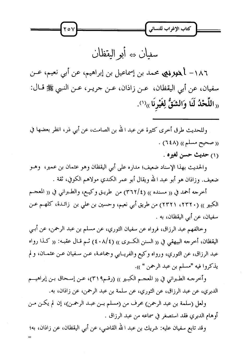 186 - أَخْبَرَنِي مُحَمَّدُ بْنُ إِسْمَاعِيلَ بْنِ إِبْرَاهِيمَ، عَنْ أَبِي نُعَيْمٍ، عَنْ سُفْيَانَ، عَنْ أَبِي الْيَقْظَانِ، عَنْ زَاذَانَ، عَنْ جَرِيرٍ، عَنِ النَّبِيِّ صَلَّى اللَّهُ عَلَيْهِ وَسَلَّمَ قَالَ: ((اللَّحْدُ لَنَا وَالشَّقُّ لِغَيْرِنَا)).