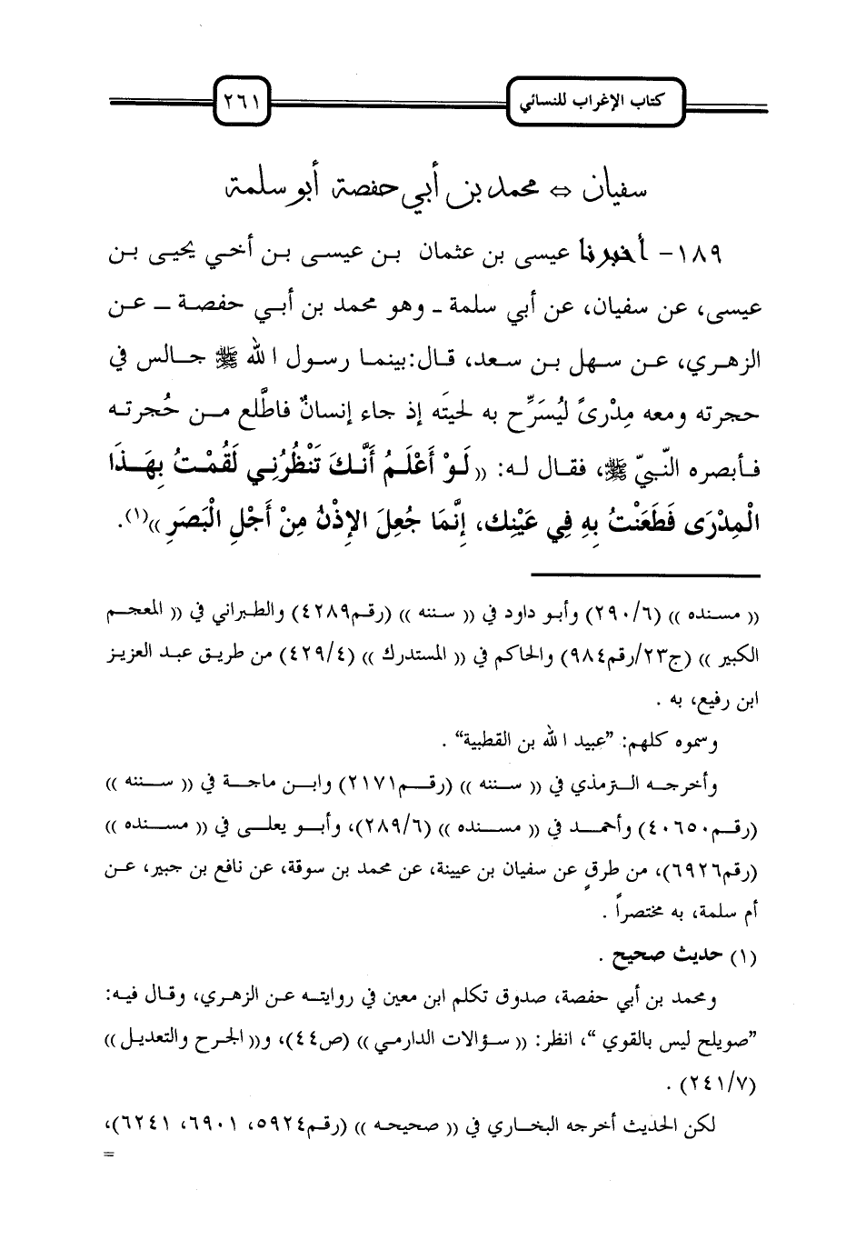 189 - أخبرنا عيسى بن عثمان بن عيسى بن أَخِي يَحْيَى بْنِ عِيسَى، عَنْ سُفْيَانَ، عَنْ أَبِي سَلَمَةَ -وَهُوَ مُحَمَّدُ بْنُ أَبِي حَفْصَةَ- عَنِ الزُّهْرِيِّ، عَنْ سَهْلِ بْنِ سَعْدٍ، قَالَ: بَيْنَمَا رَسُولُ اللَّهِ صَلَّى اللَّهُ عَلَيْهِ وَسَلَّمَ جَالِسٌ فِي حُجْرَتِهِ وَمَعَهُ مِدْرًى لِيُسَرِّحَ بِهِ لِحْيَتَهُ إِذْ جَاءَ إنسانٌ فَاطَّلَعَ مِنْ حُجْرَتِهِ فَأَبْصَرَهُ النَّبِيُّ صَلَّى اللَّهُ عَلَيْهِ وَسَلَّمَ، فَقَالَ لَهُ: ((لَوْ أَعْلَمُ أَنَّكَ تَنْظُرُنِي لَقُمْتُ بِهَذَا الْمِدْرَى فَطَعَنْتُ بِهِ فِي عَيْنِكَ، إِنَّمَا جُعِلَ الإِذْنُ مِنْ أَجْلِ الْبَصَرِ)).